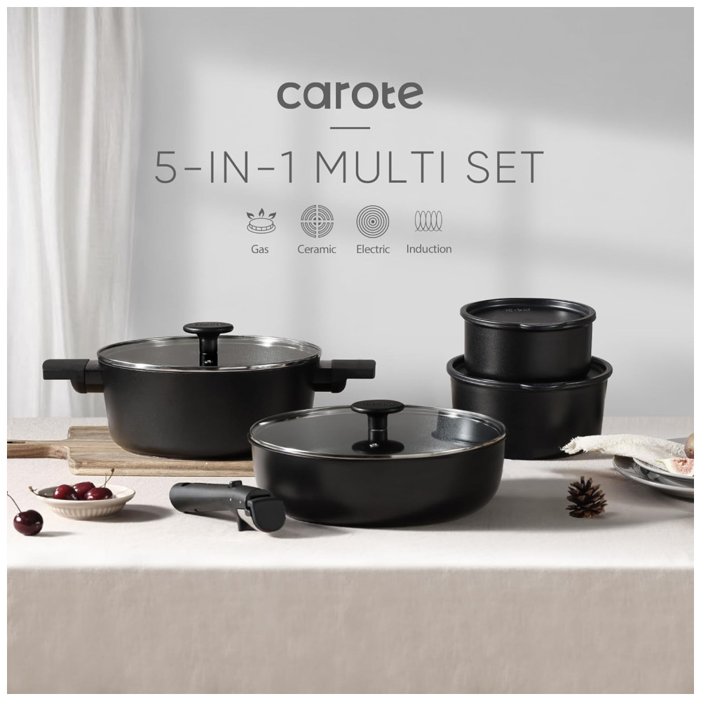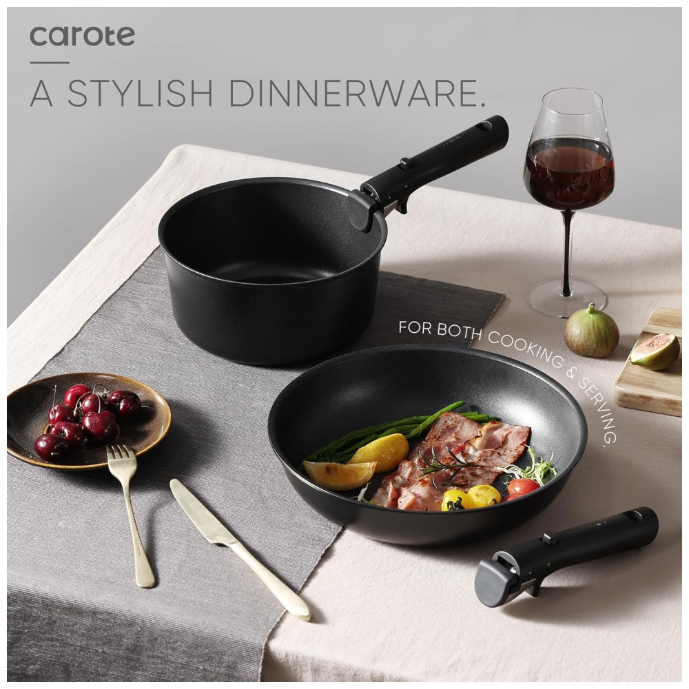 Jogo de Panelas CAROTE 13 peças Antiaderente com Alça Removível – Preto Ébano