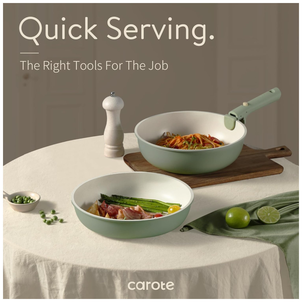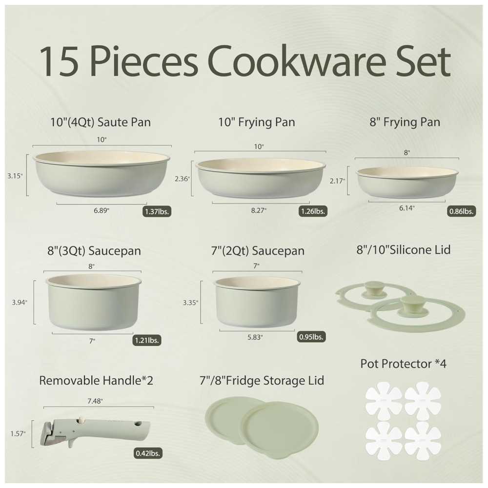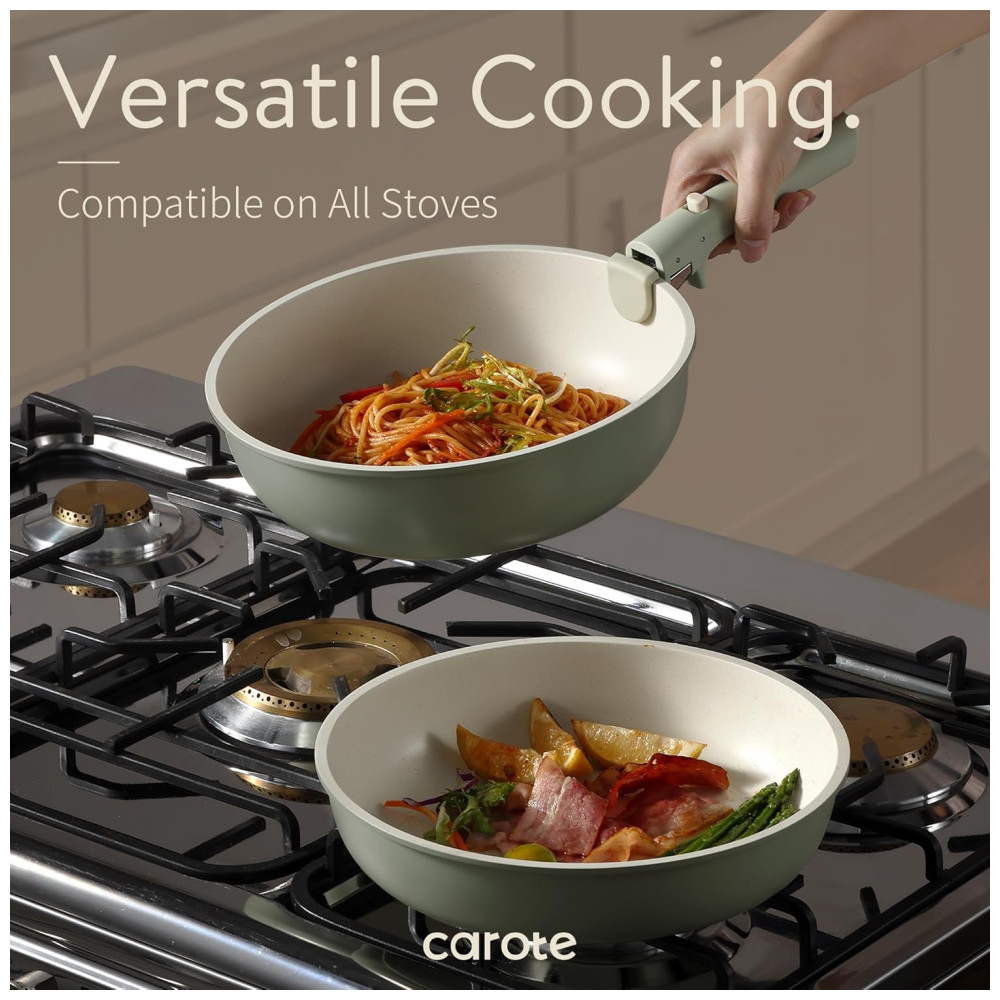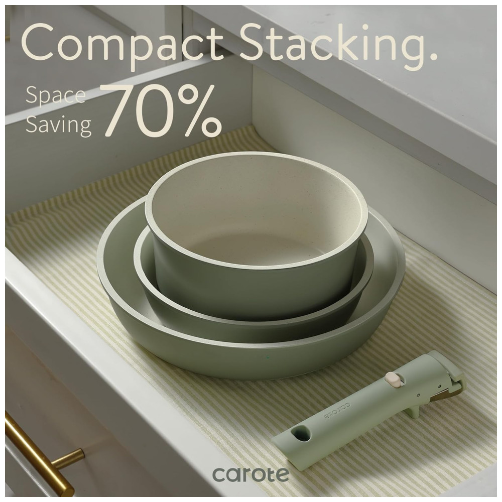 Jogo de Panelas CAROTE Jogo de Utensílios de Cozinha Antiaderente com Cabo Removível 15 peças Verde Sálvia