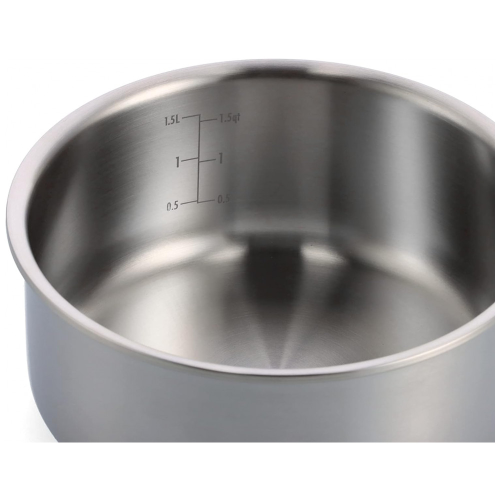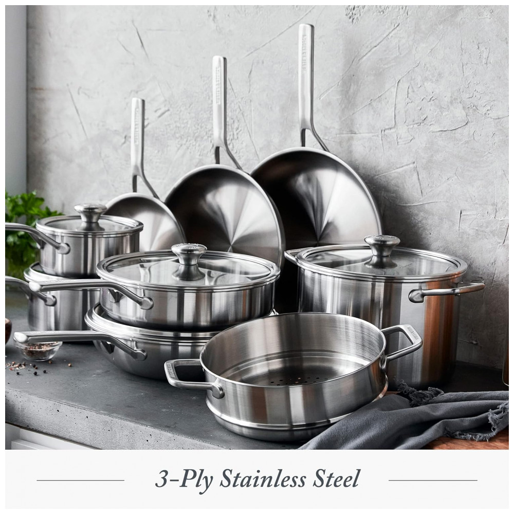 O conjunto de panelas inclui: frigideiras de , e Wok de com tampa Frigideira 3,5 litros com tampa Panelas 1,5 litros e 3 litros com tampa Caldeirão 8 litros com tampa e vaporizador de aço inoxidável.