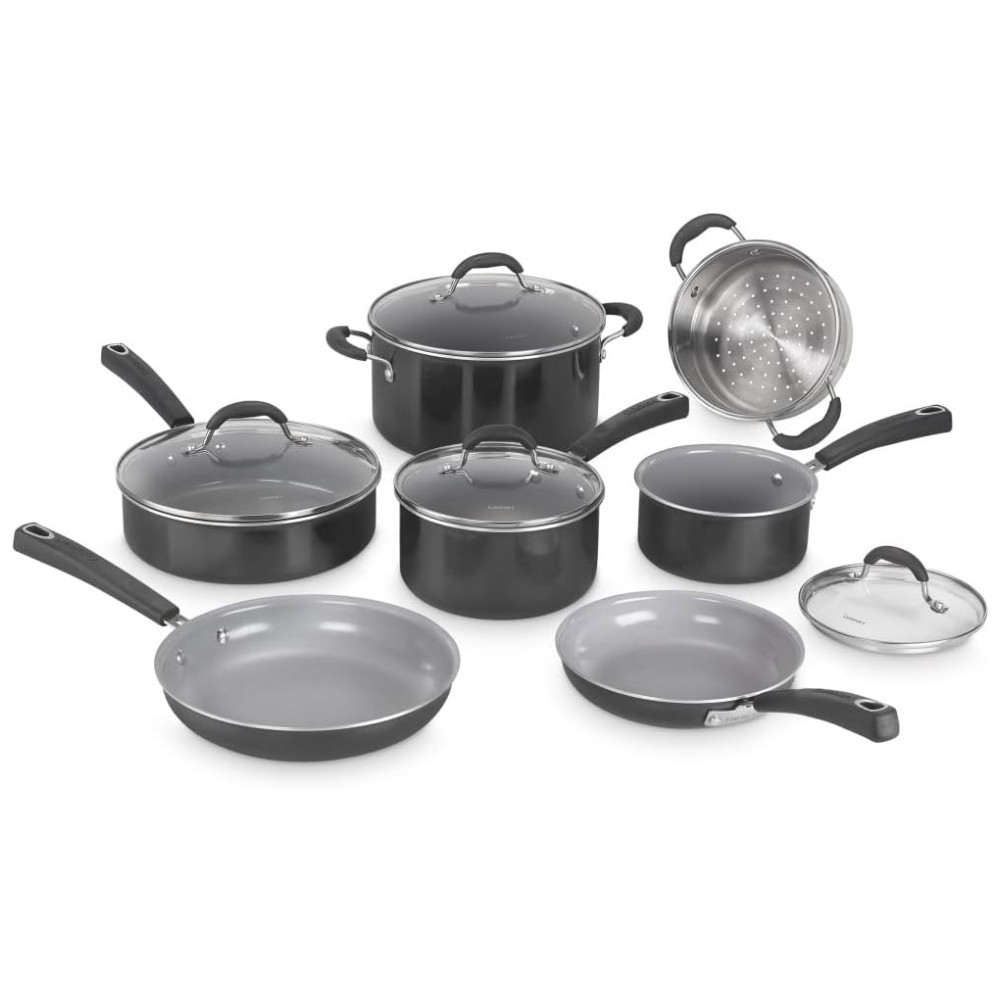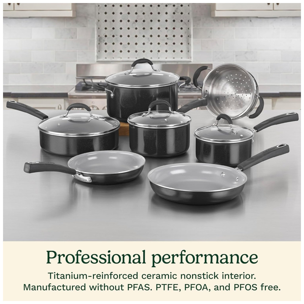 Jogo de Panelas com Interior Antiaderente Revestido de Cerâmica e Reforçado com Titânio com 11 Peças Cabo em Silicone e Tampas de Vidro Cuisinart 733-30H Preta