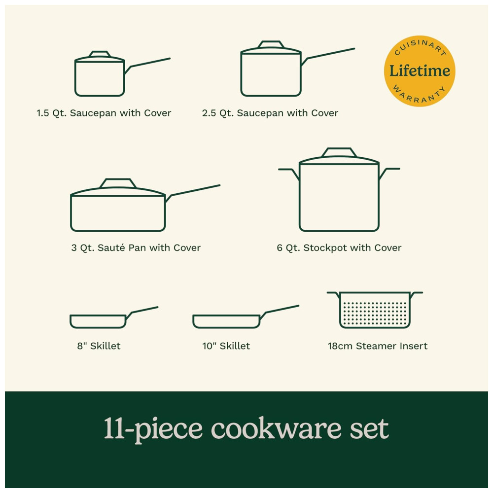 Este conjunto de panelas antiaderentes Cuisinart é perfeito para cozinhar uma ampla variedade de alimentos. Inclui quatro panelas com tampa – 1,4 litros, 2,33 litros, 5,6 litros – e duas frigideiras de 20 cm e 25 cm, além de um acessório para cozimento a vapor de 18 cm. Com essas opções, você pode ferver, refogar, fritar, cozinhar a vapor e muito mais.