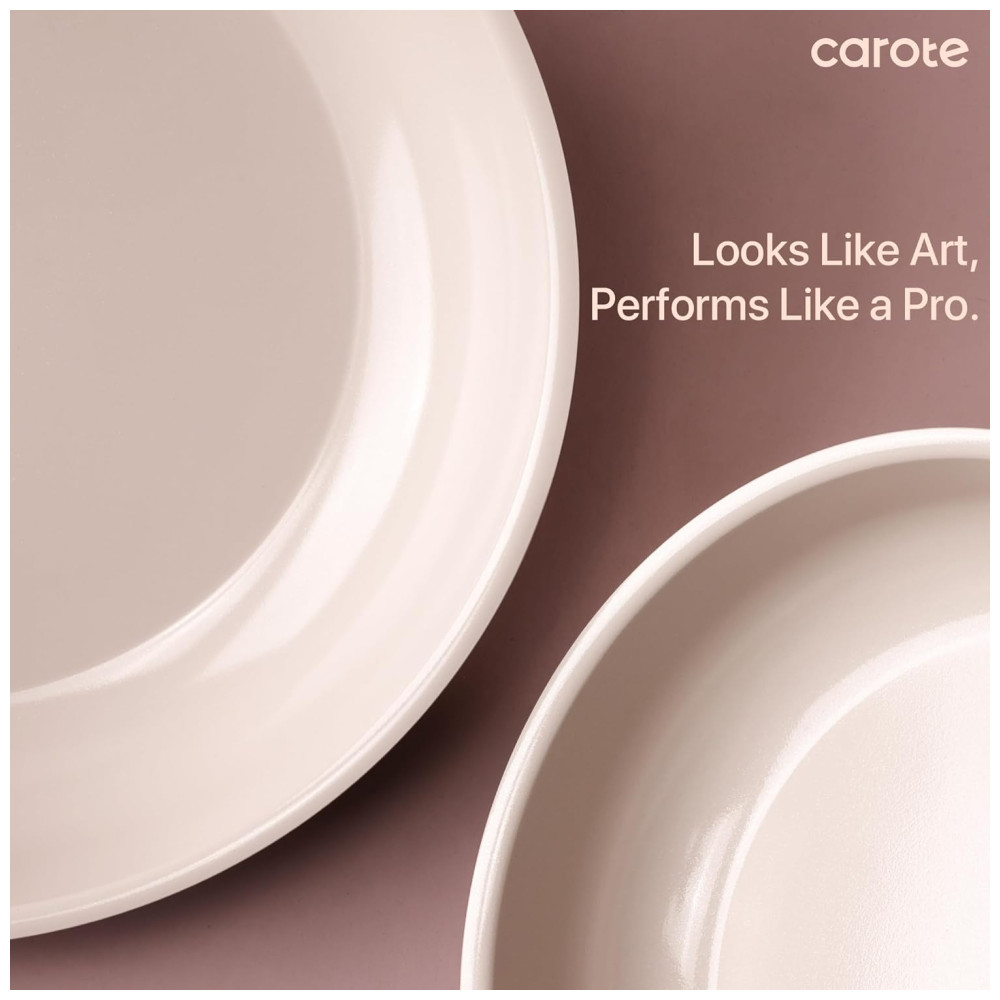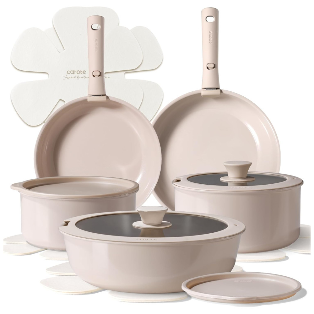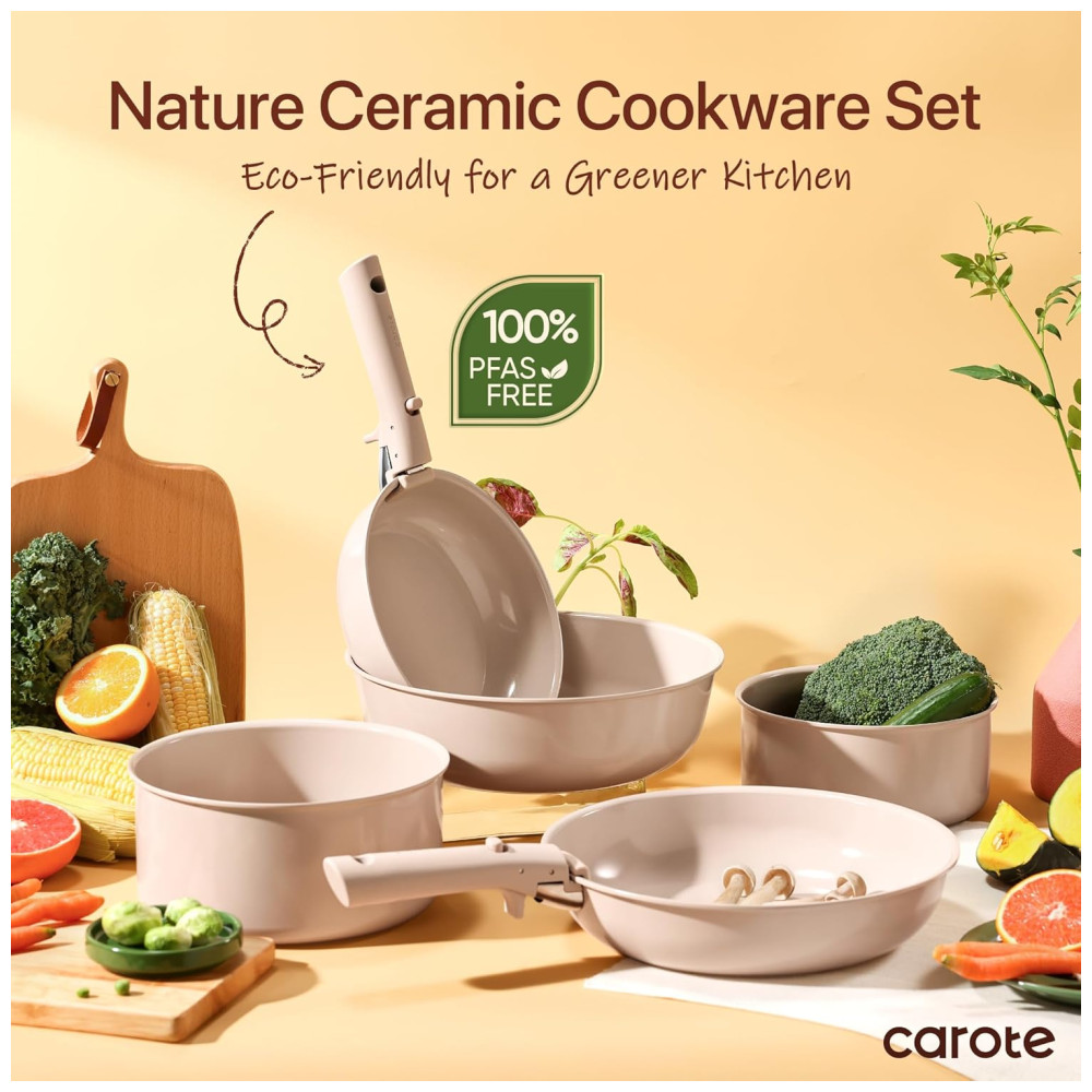 Este conjunto de panelas é fabricado com cerâmica natural de alta qualidade, garantindo excelente desempenho antiaderente, liberando os alimentos facilmente e proporcionando uma culinária mais saudável. O revestimento cerâmico avançado foi projetado para uma durabilidade superior, com resistência a riscos e manchas, mantendo suas panelas em ótimo estado ao longo do tempo. Livre de PFOA, PTFE, PFAS, chumbo e cádmio, este conjunto é 100% atóxico para garantir segurança durante o cozimento. Compatível com fogão a gás, elétrico, indução e forno, as panelas CAROTE são versáteis e práticas. O jogo inclui frigideiras, panelas, frigideira, tampas de silicone e de armazenamento, alças removíveis e protetores de panela.