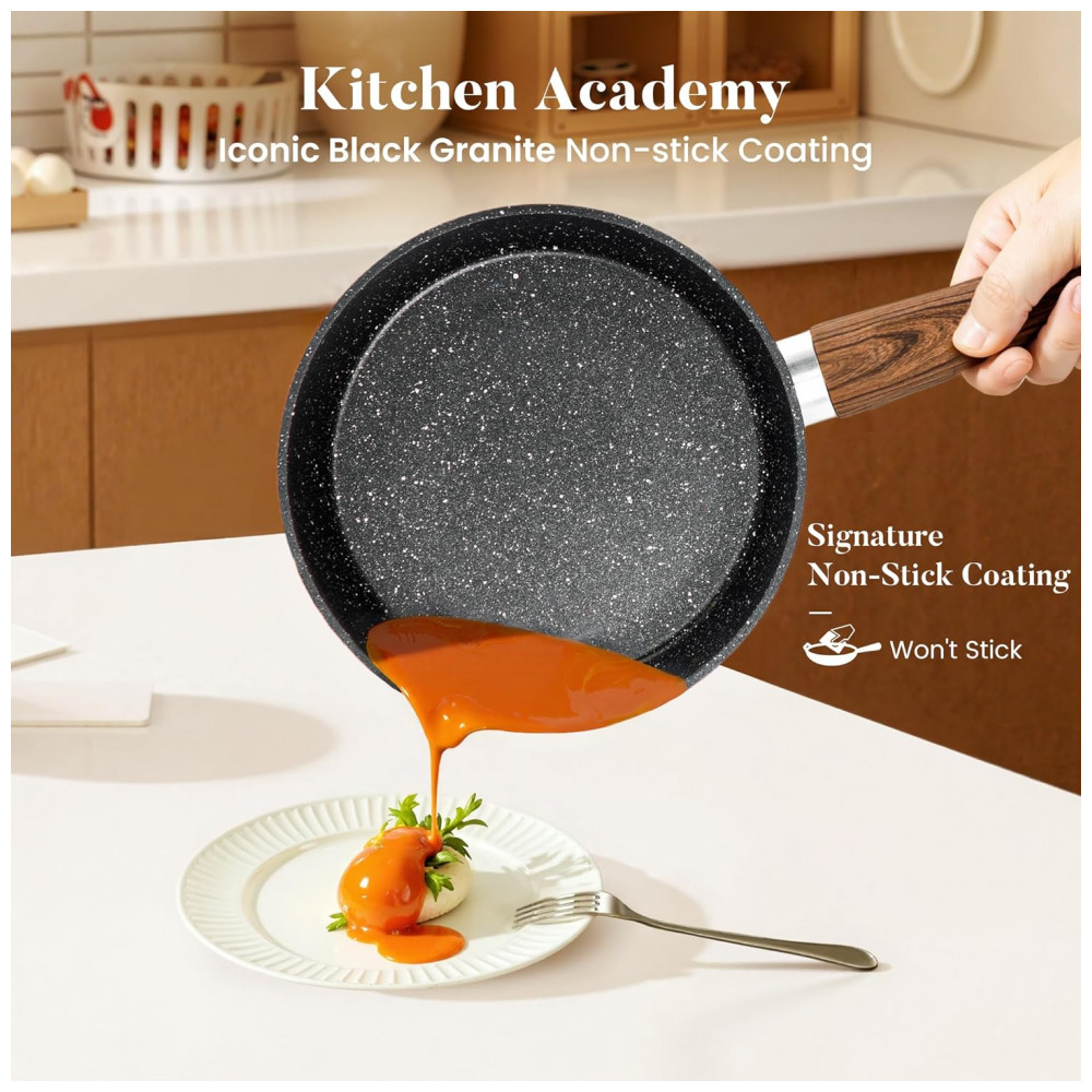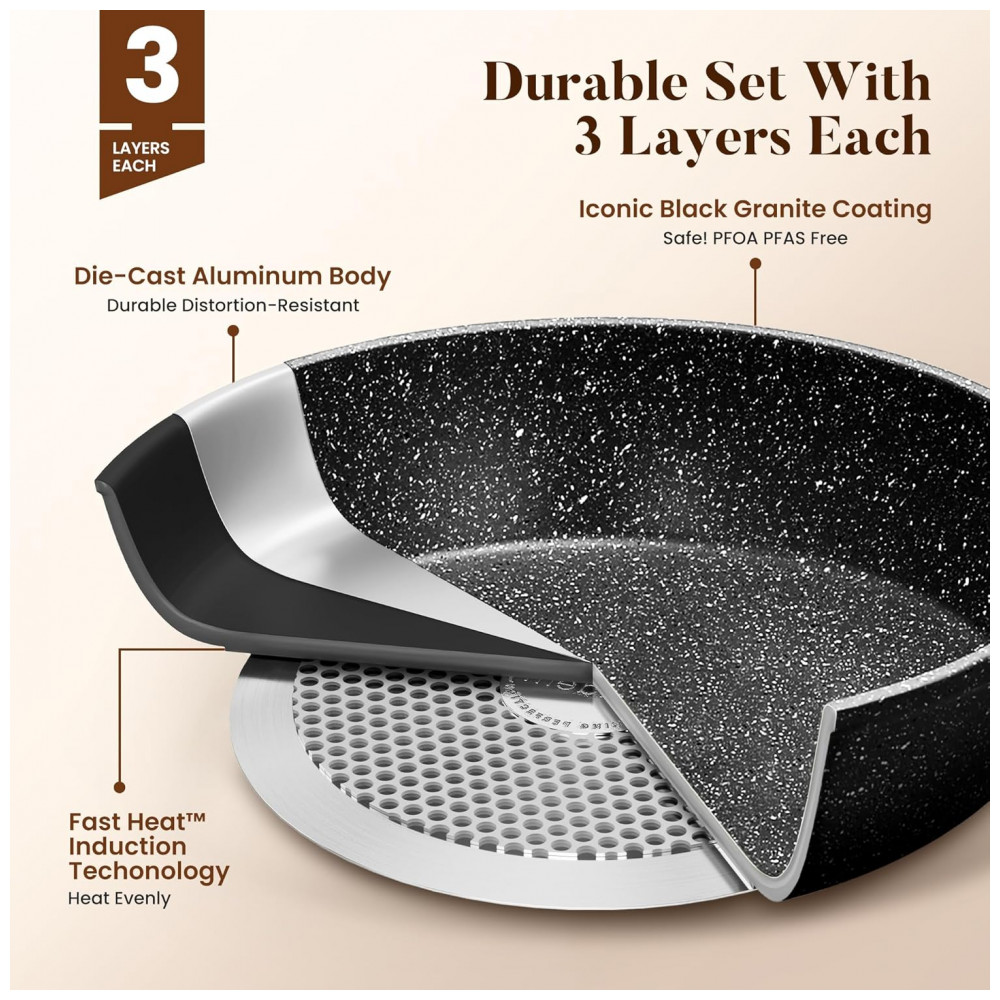 Conjunto de panelas e frigideiras antiaderentes Na hora de comprar utensílios de cozinha, uma das coisas importantes é o desempenho antiaderente. O revestimento de granito faz um bom trabalho evitando que os alimentos grudem. Além disso, você poderá preparar refeições mais saudáveis para sua família, já que não precisará usar tanto óleo. Você pode cozinhar molho de tomate com segurança em panelas de granito o sabor e o cheiro da comida não mudarão, mesmo se você usar ingredientes ácidos ou com cheiro forte.