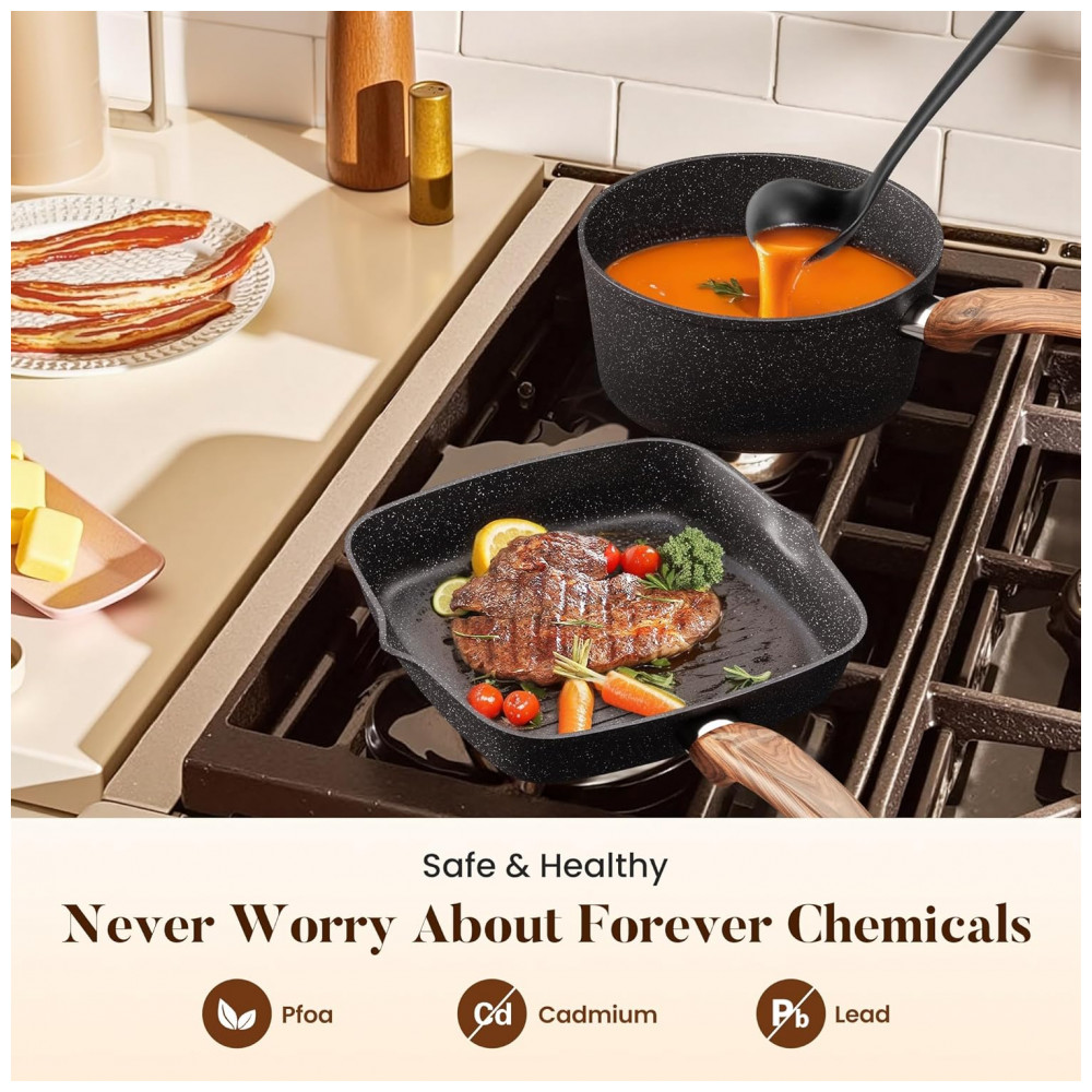 Conjunto de panelas sem toxinas Ao comprar um conjunto de utensílios de cozinha, certifique se de que ele indique claramente que ele é livre de chumbo, livre de PFOS e livre de PFOA. As panelas não podem conter estas três substâncias, pois representam riscos potenciais para o organismo. Felizmente, você pode obter panelas de granito livres desses produtos químicos nocivos. Para mais saudável e ecológico.