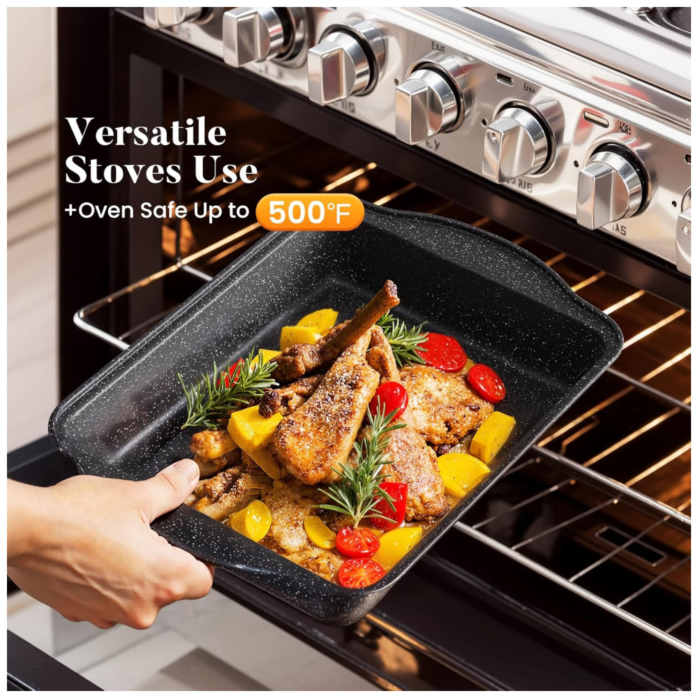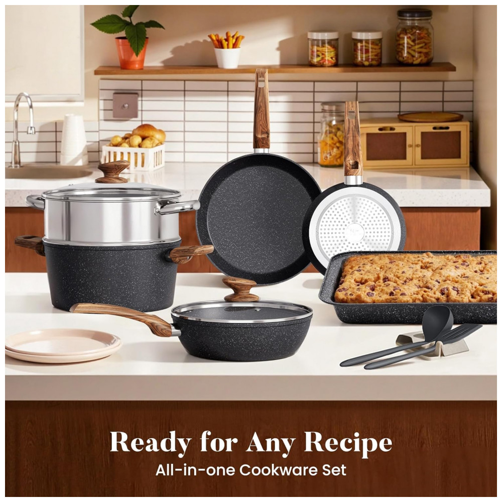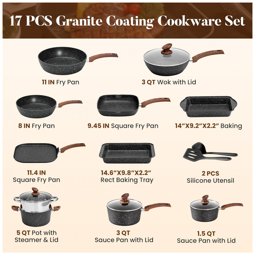 Conjunto de panelas de cozinha com 17 peças Inclui frigideira de 20,32 centímetros , frigideira de 27,94 centímetros , wok de 24,13 centímetros com tampa , frigideira quadrada de 24,13 centímetros , frigideira quadrada de 28,96 centímetros , panela de 1,5 litros com tampa , caçarola de 2,84 litros com tampa , Caçarola de 4,73 litros com tampa , Vaporizador de 4,73 litros , Forma para assar 35,56 x 23,37 x 5,59 centimetros , Bandeja retangular 37,08 x 24,89 x 5,59 centimetros , 2 peças de utensílios de silicone. Fácil de limpar e para máquina de lavar louça