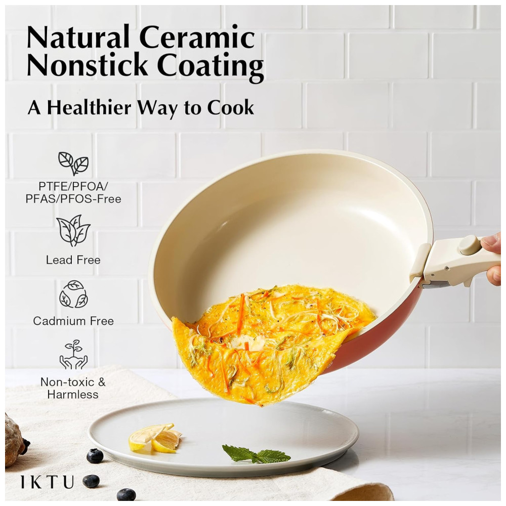 Revestimento Seguro e Saudável: O conjunto de utensílios de cozinha IKTU apresenta um revestimento cerâmico superior certificado pela SGS, garantido como livre de produtos químicos nocivos como PTFE, PFAS e PFOA. Sua excelente resistência ao desgaste proporciona uma experiência de cozimento duradoura, protegendo a saúde de você e sua família.