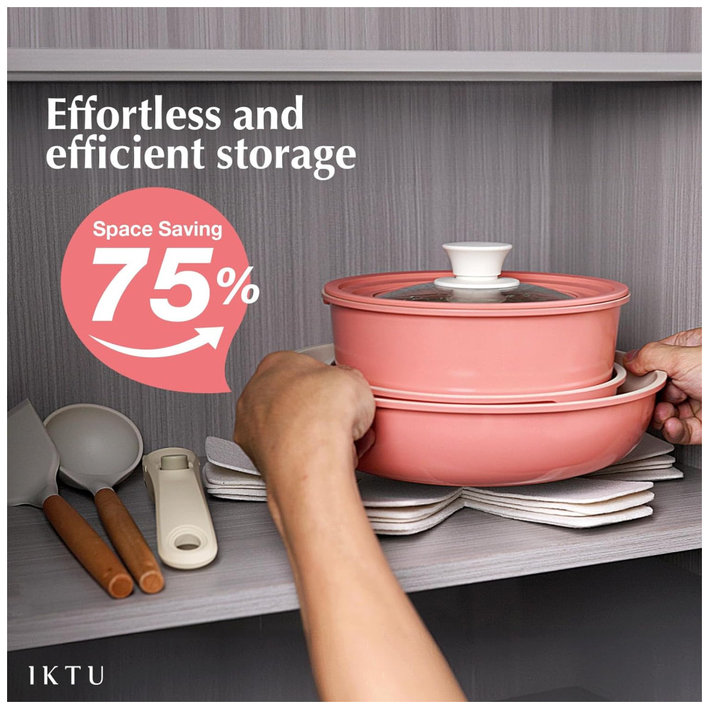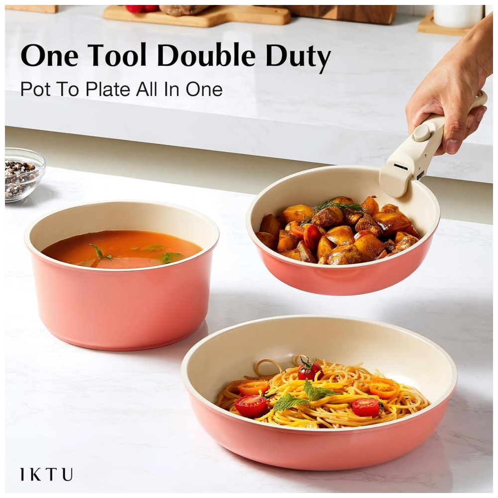 Jogo de Panelas e Frigideiras Antiaderentes de Cerâmica com 19 Peças Cabo Removível e Utensílios de Cozinha IKTU Rosa