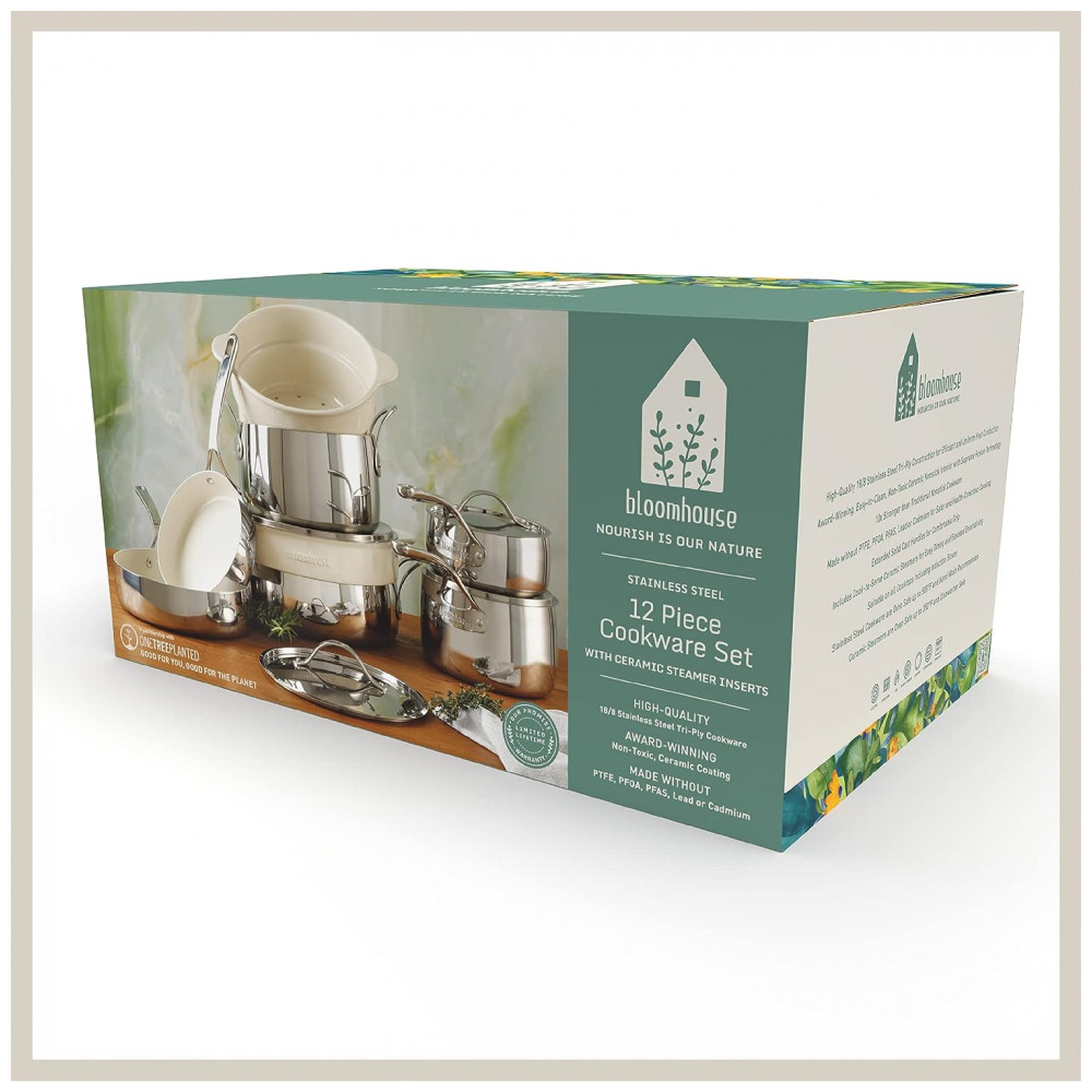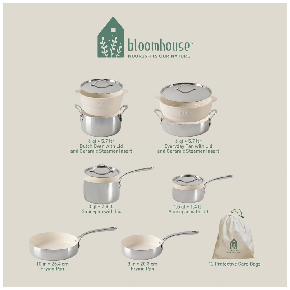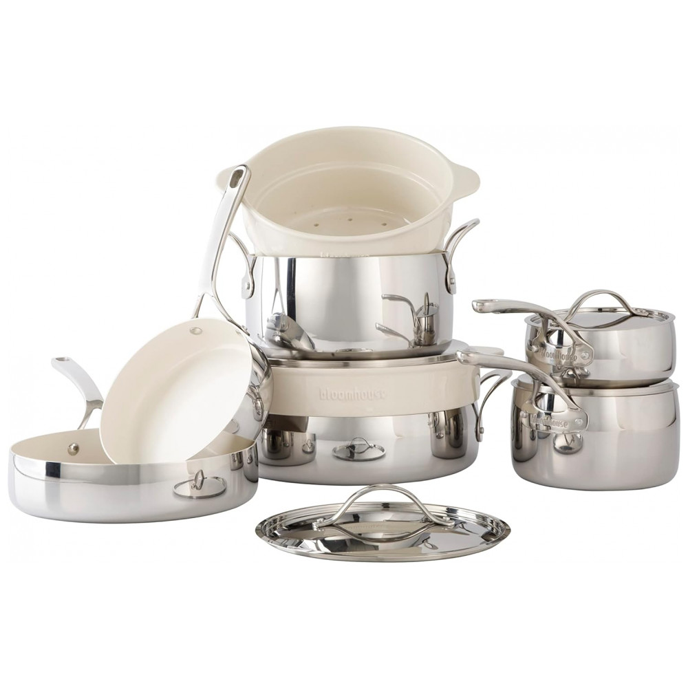 Jogo de Panelas e Frigideiras Antiaderentes em Aço Inoxidável com Revestimento Cerâmico 12 Peças Bloomhouse Prata