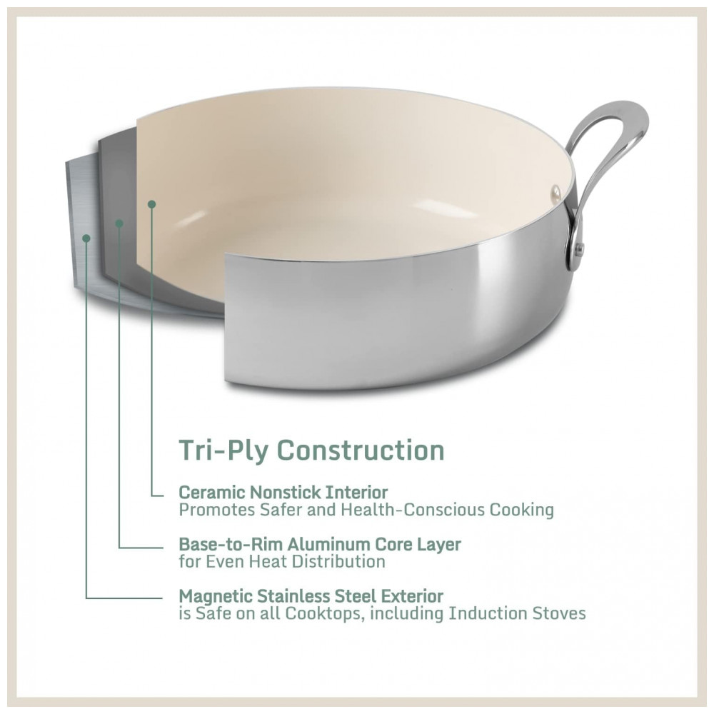 PARA FORNO nosso conjunto de panelas de aço inoxidável antiaderente atóxico também é para forno de até 550F 232C com tampas de vidro. Inserções de vapor de cerâmica são seguras para forno até 350F 177C