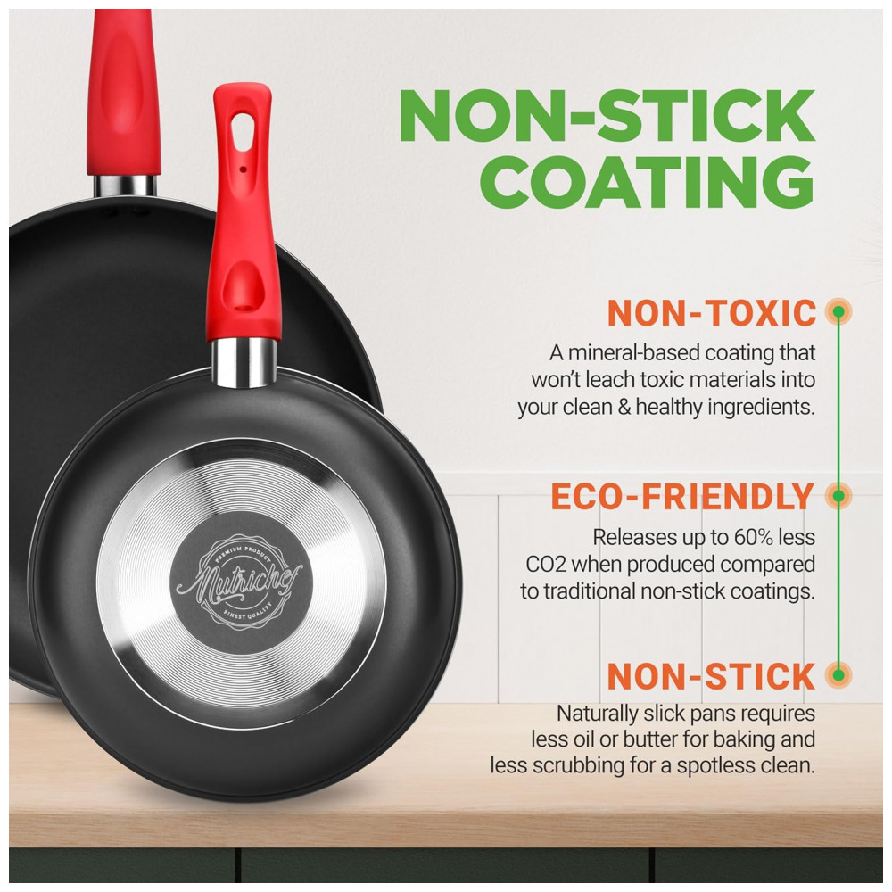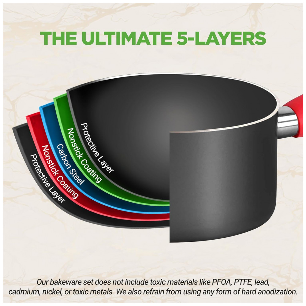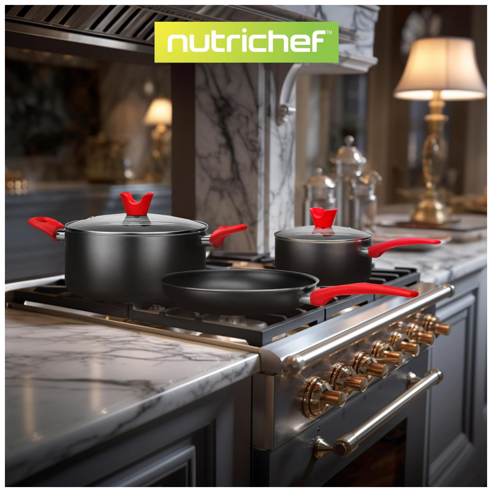 REVESTIMENTO ANTI ADERENTE O conjunto de panelas antiaderentes de vários tamanhos NutriChef apresenta um revestimento antiaderente de longa duração para fácil liberação ou lançamento de alimentos, limpeza e cozimento saudável com exterior de laca resistente ao calor, tornando o resistente a altas temperaturas.