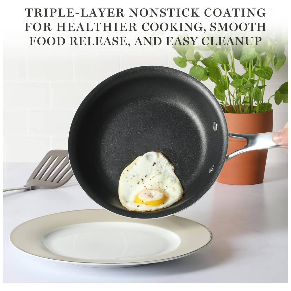 FEITO SEM PFOA O revestimento Platinum SR de camada tripla reforçado é a melhor superfície antiaderente, tornando o cozimento mais saudável, liberando alimentos mais suaves e limpando mais facilmente.