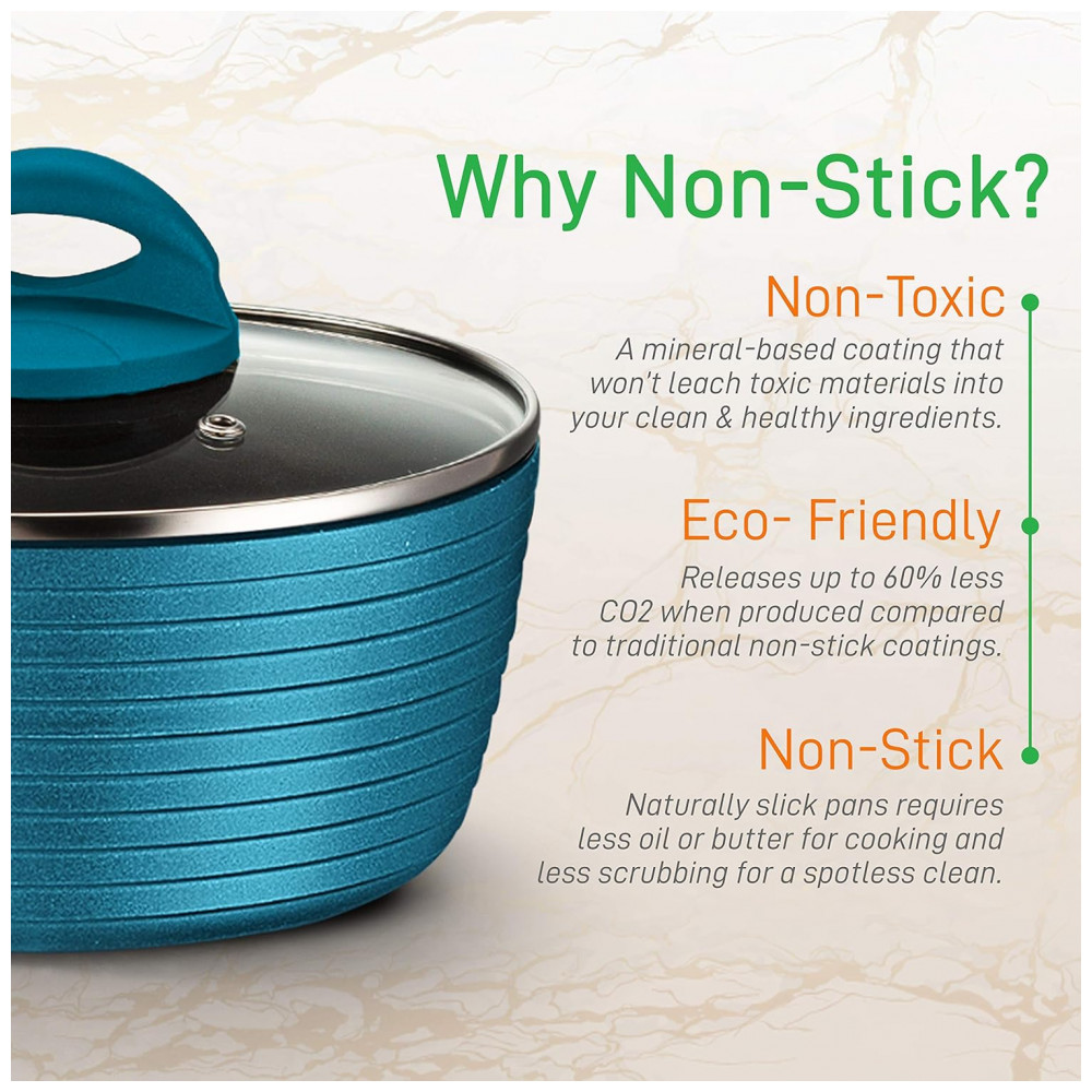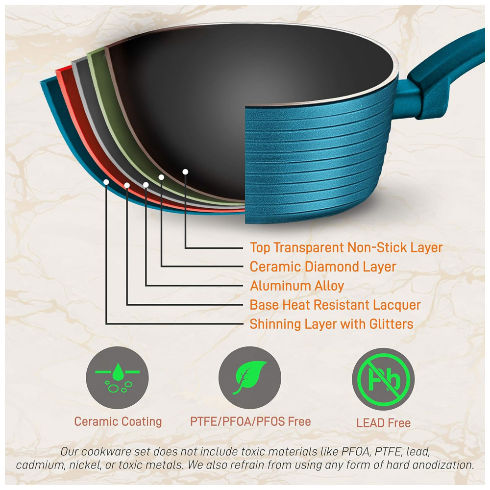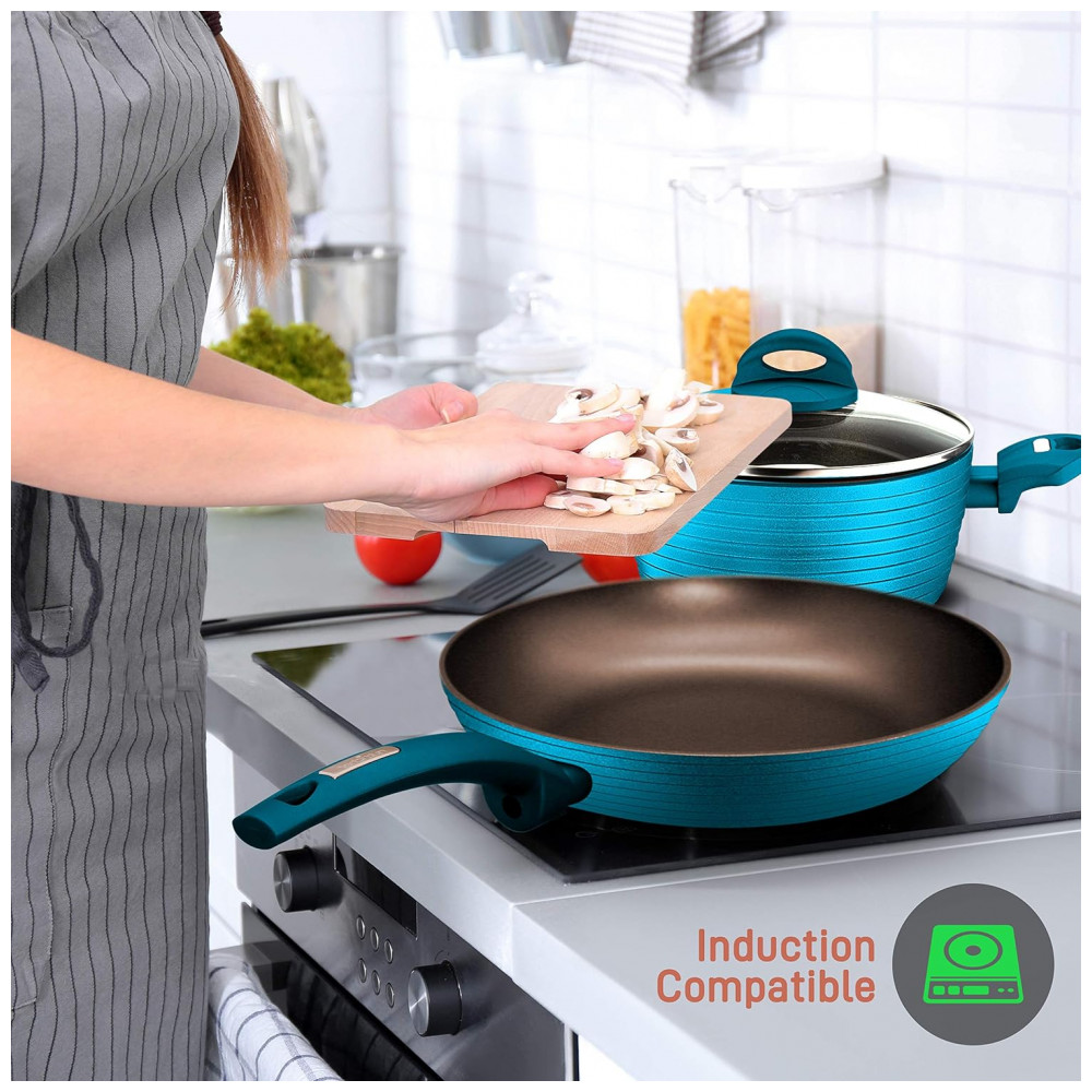 PRONTO PARA INDUÇÃO Estas panelas e frigideiras são seguras para uso em balcões de gás, elétricos, cerâmicos e de indução. Feito de alumínio forjado reforçado com espessura de revestimento de 18 25um, multicamadas de 4,. Inclui utensílios de silicone de nylon resistente ao calor
