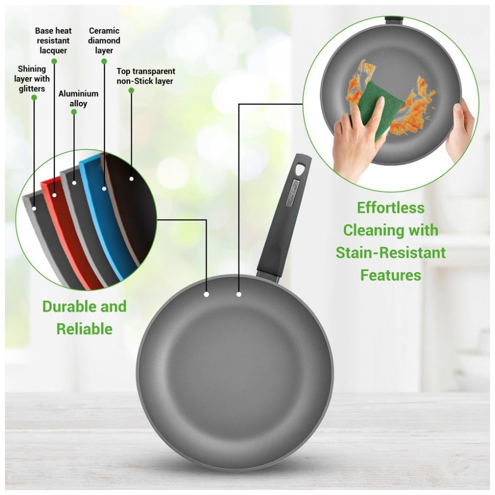 REVESTIMENTO ANTI ADERENTE O conjunto de utensílios de cozinha antiaderente apresenta um revestimento antiaderente durável e duradouro para facilitar a liberação ou lançamento de alimentos, limpeza e cozimento saudável. Tem um exterior anodizado rígido que torna os utensílios de cozinha resistentes ao calor elevado.