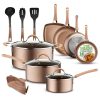 PRONTO PARA INDUÇÃO Estas panelas e frigideiras são seguras para uso em balcões de gás, elétricos, cerâmicos e de indução. Feito de alumínio forjado reforçado com espessura de revestimento de 18 25um, multicamadas de 4,. Inclui utensílios de silicone de nylon resistente ao calor