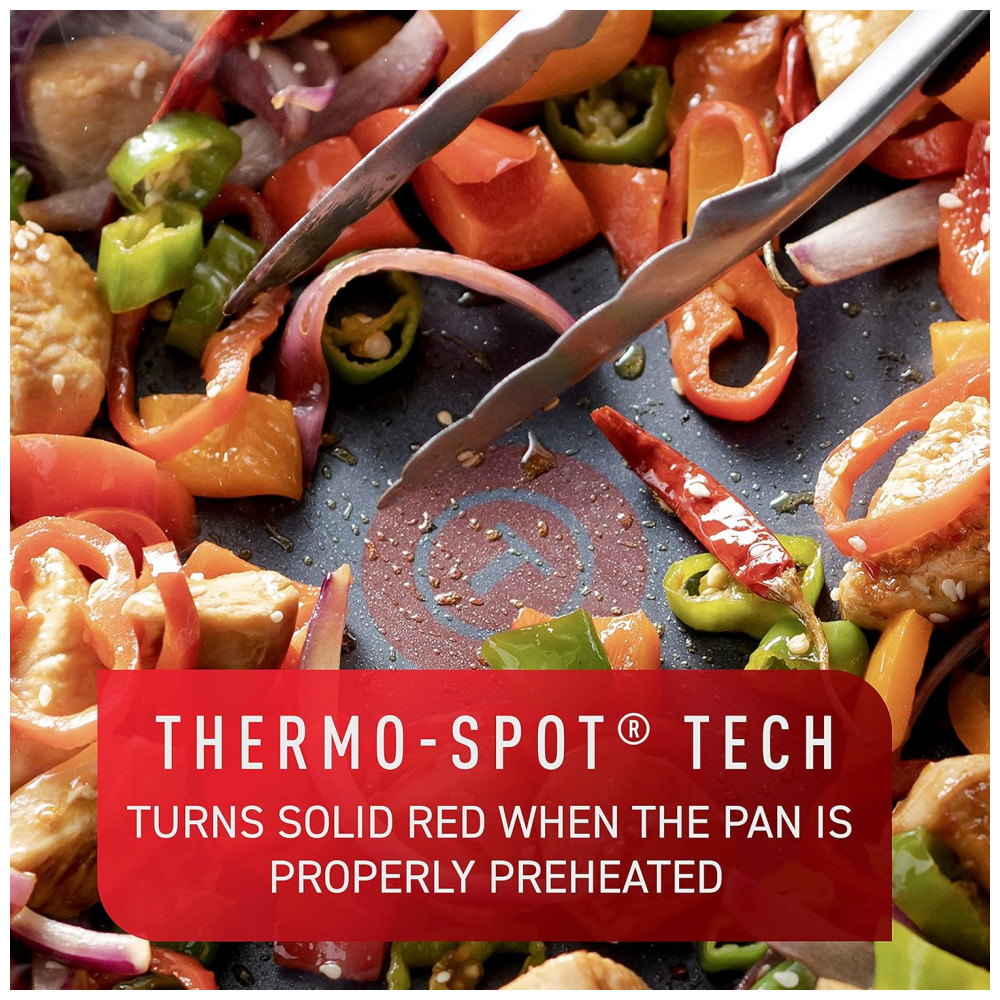 O Thermo Spot fica vermelho sólido para indicar quando a frigideira está devidamente pré aquecida somente em frigideiras e frigideiras.
