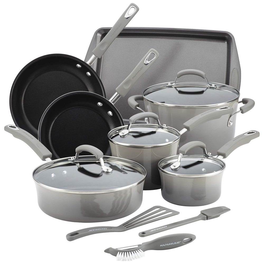 Jogo de Panelas e Frigideiras Antiaderentes em Alumínio com Utensílios 14 Peças Rachael Ray Cinza
