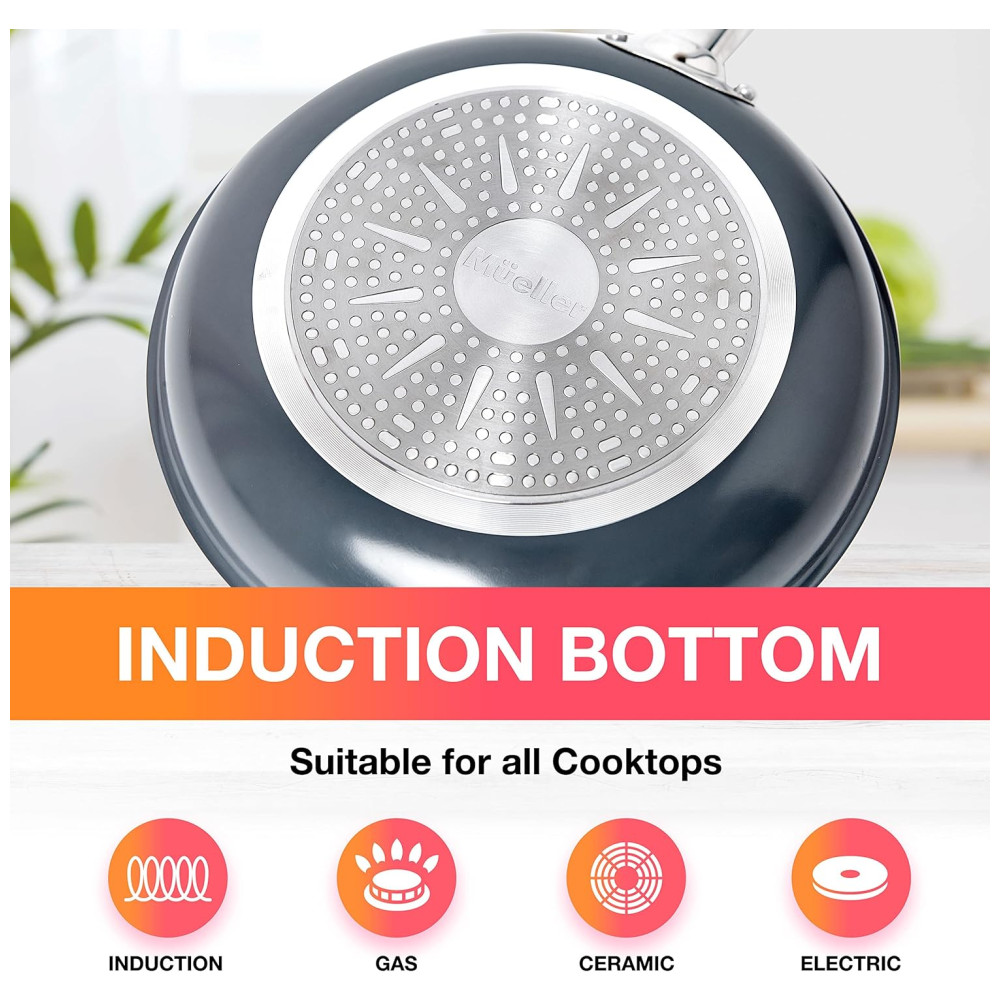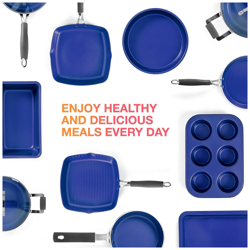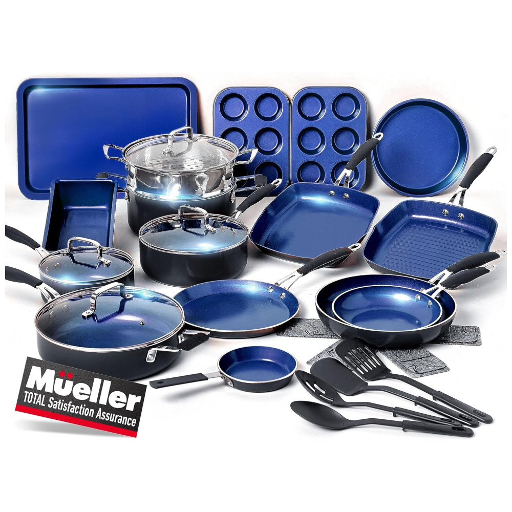 Ultimate Cookware and Bakeware Set A coleção Mueller de panelas Sapphire e conjunto de assadeiras atenderá a todas as suas necessidades de cozimento. Este conjunto minimiza as chances de queimar alimentos por causa do fundo antiaderente e distribuição uniforme do calor. Construído para durar. Este material é resistente a arranhões. Não enferruja. Mesmo quando desenvolve uma pátina esverdeada, você pode eliminá la e recuperar aquele brilho radiante.