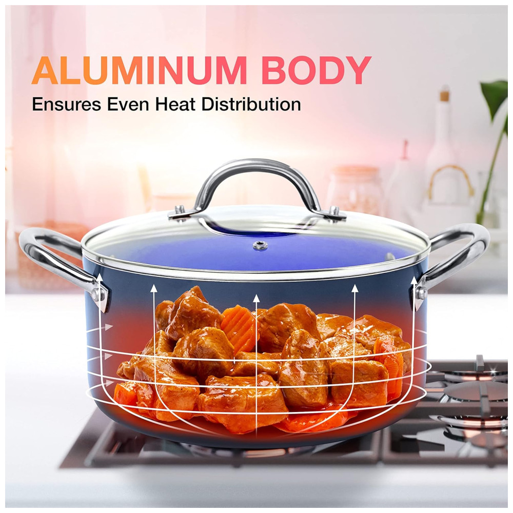 Distribuição uniforme do calor A construção de alumínio premium das frigideiras e panelas proporcionará resultados de cozimento consistentes. O calor é conduzido e distribuído de forma rápida e uniforme, economizando tempo de cozimento e requisitos de energia, pois apenas o calor baixo a médio é necessário. O revestimento premium evita ferrugem e facilita a limpeza. Ele também inclui alças de fácil manuseio que permanecem frias durante o cozimento.