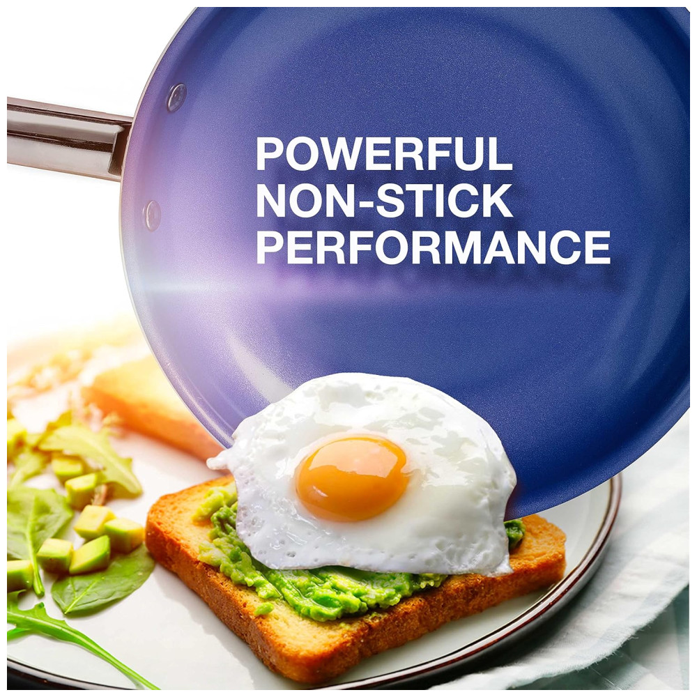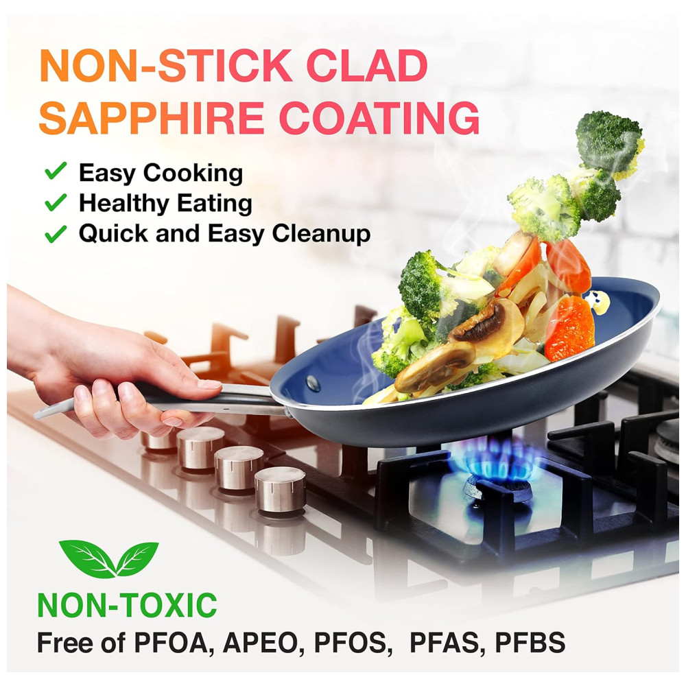 Saudável sem sacrificar a durabilidade O revestimento de safira antiaderente de qualidade do conjunto de utensílios de cozinha torna o cozimento simples com liberação de alimentos sem esforço e chance mínima de queimar. O revestimento sem Teflon é livre de produtos químicos agressivos, incluindo PFOA, APEO, PFOS, PFAS, PFBS, Chumbo, Cádmio e com pouco óleo necessário, o cozimento saudável é garantido. Para tornar as coisas ainda mais fáceis, o conjunto de panelas foi projetado especificamente para ser leve, mas super forte para cozinhar saudável nos próximos anos