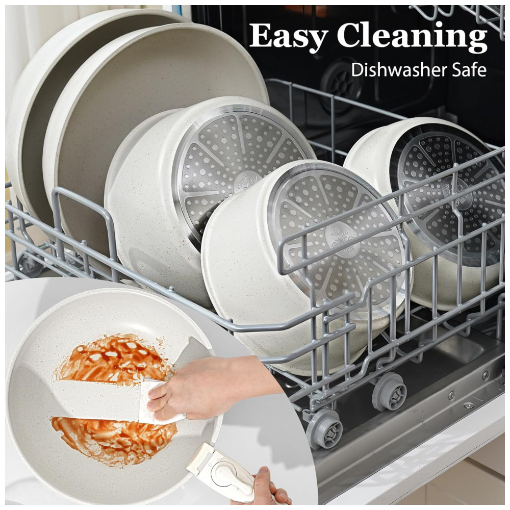 Revestimento Antiaderente de Alta Qualidade: Este conjunto é feito com um revestimento antiaderente premium, garantindo uma experiência de cozimento impecável. Cozinhe com menos óleo e desfrute da liberação de alimentos sem esforço, tornando suas receitas favoritas mais saudáveis e fáceis de preparar.