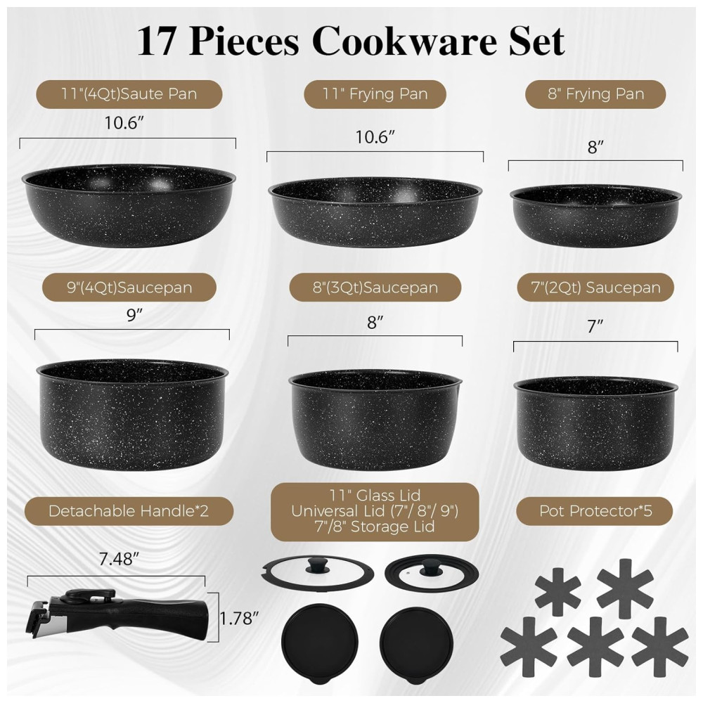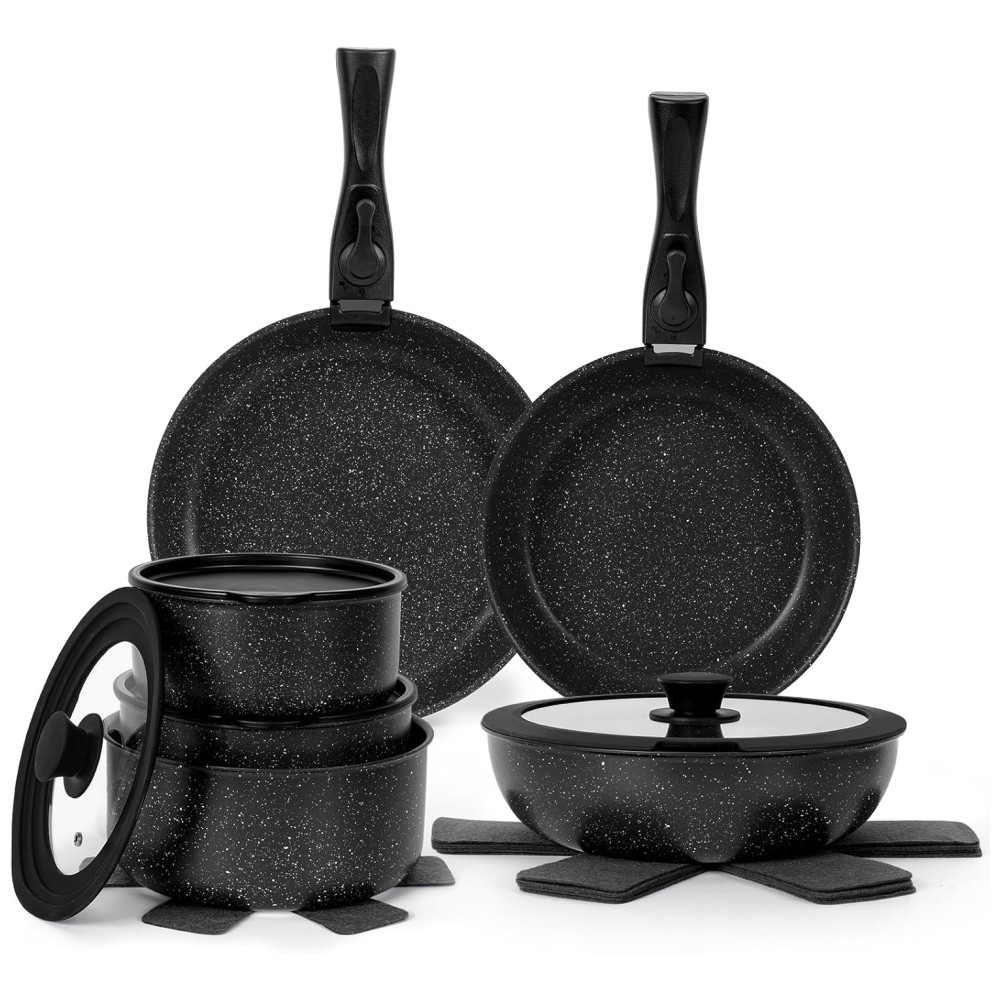 Jogo de Panelas e Frigideiras Antiaderentes em Granito com 17 Peças e Cabo Removível SODAY Preto