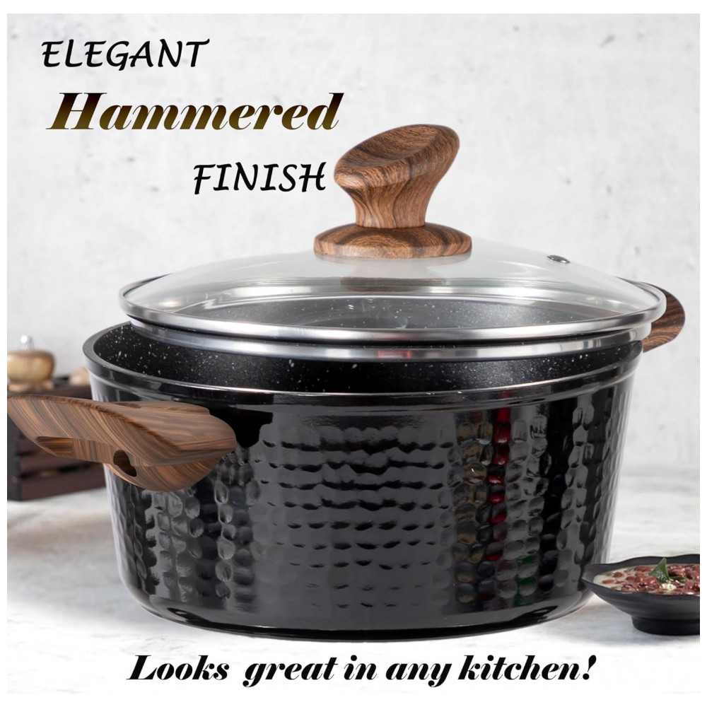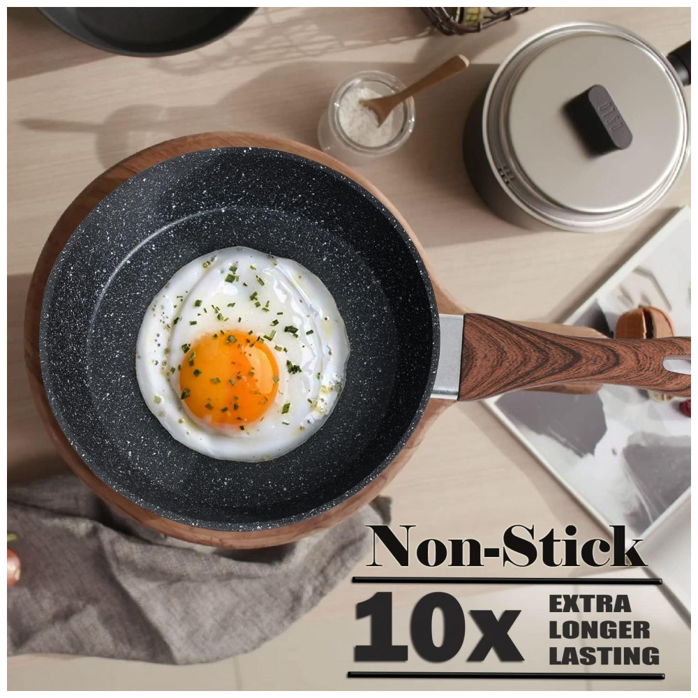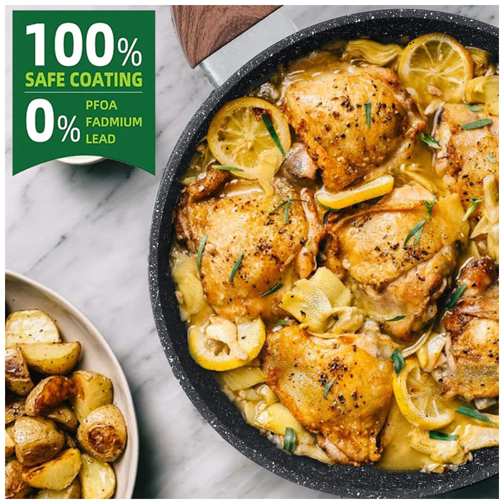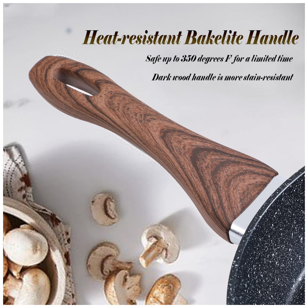 Conjunto de panelas e frigideiras antiaderentes Ao comprar utensílios de cozinha, uma das coisas importantes são os recursos antiaderentes. O revestimento de granito faz um bom trabalho para evitar que os alimentos grudem. Além disso, você poderá preparar refeições mais saudáveis para sua família, já que não precisará usar tanto óleo. Você pode cozinhar molho de tomate com segurança em panelas de granito, o sabor e o cheiro de sua comida não mudarão, mesmo se você usar ingredientes ácidos ou com cheiro forte.