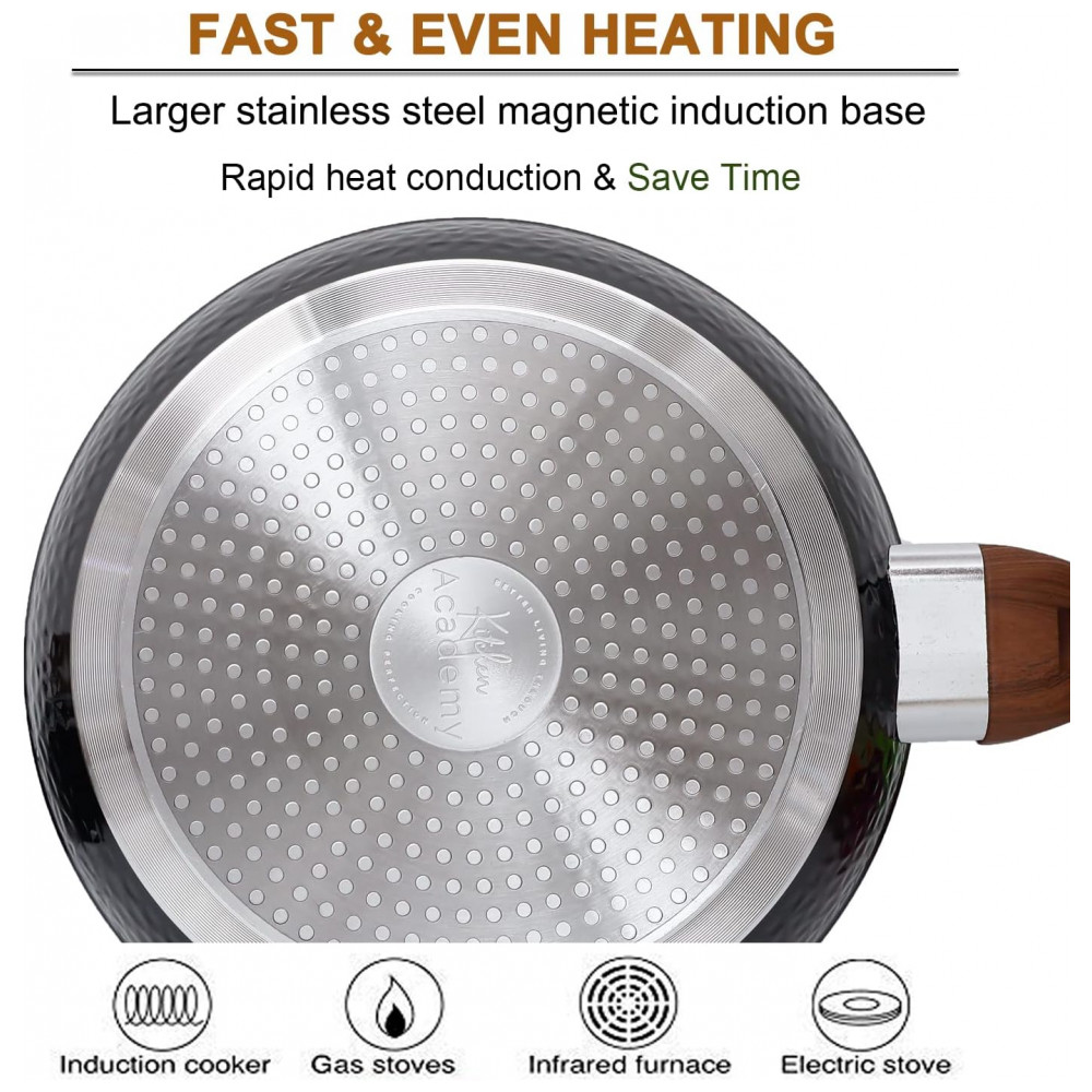 Conjuntos de panelas de indução No que diz respeito ao interior, esta panela utiliza um núcleo de alumínio. O resultado é que a panela aquece rapidamente e, mais importante, distribui o calor uniformemente. O conjunto de panelas funciona em todos os principais tipos de cooktops, incluindo de indução. Sele a carne, refogue ou até mesmo use a como wok para fritar arroz.