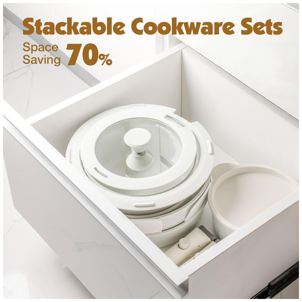 Fácil Armazenamento: Economize até 70% mais espaço com o conjunto de panelas e frigideiras empilháveis e alças removíveis, permitindo um armazenamento prático em armários ou trailers.