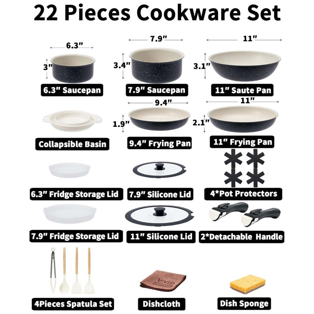 Jogo de Panelas e Frigideiras Antiaderentes Material em Alumínio com 22 Peças Cabo Removível e Utensílios de Cozinha VIVIDCOOKWARE Preto