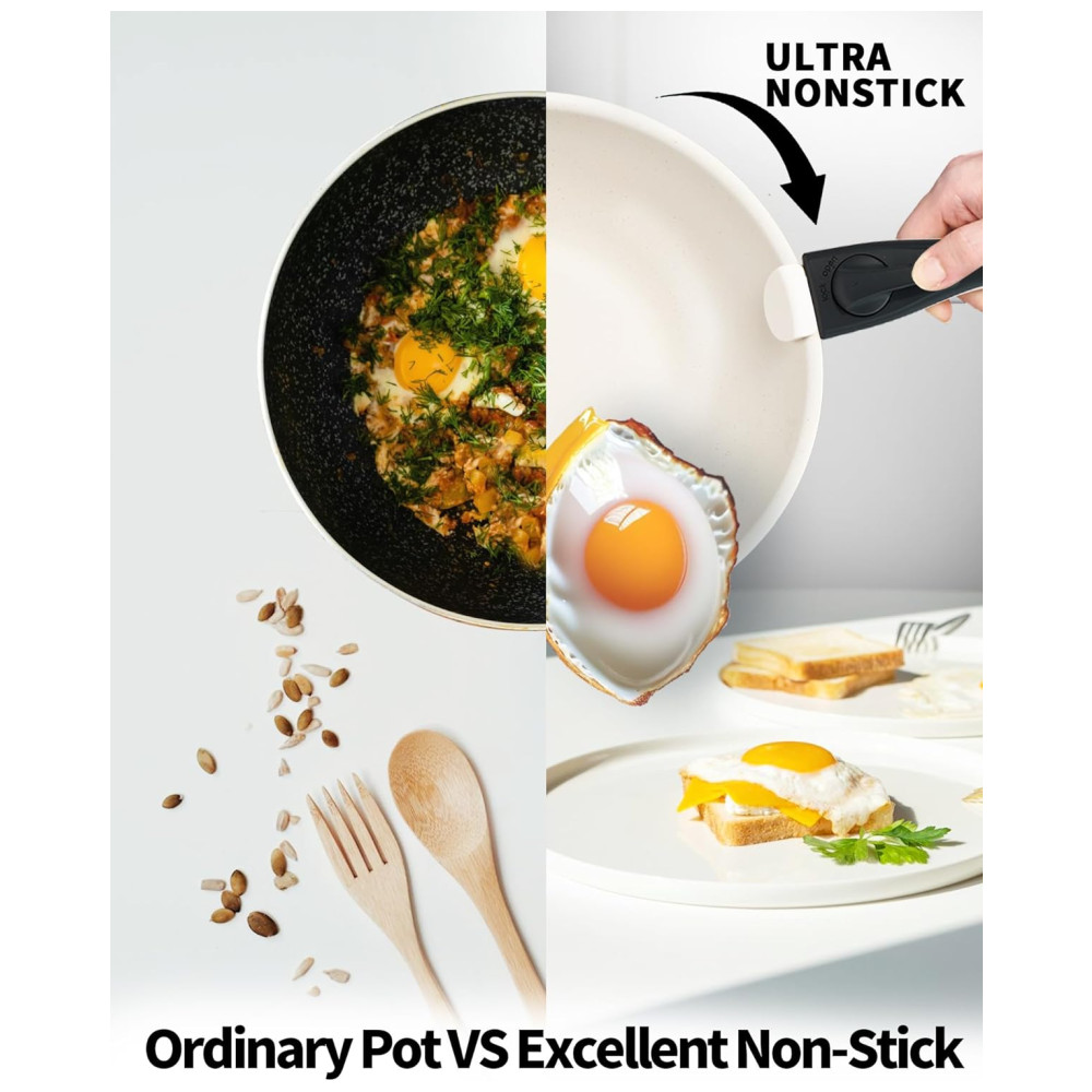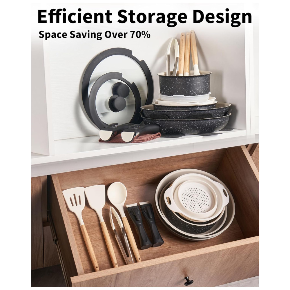 Solução Definitiva para Economia de Espaço: Nosso conjunto de panelas e frigideiras antiaderentes possui alças removíveis, tornando o armazenamento muito mais fácil. Você pode empilhar e organizar suas panelas sob o armário, economizando até 70% mais espaço em comparação com conjuntos tradicionais.