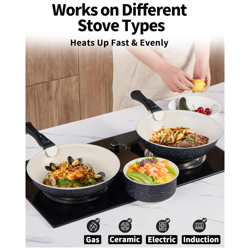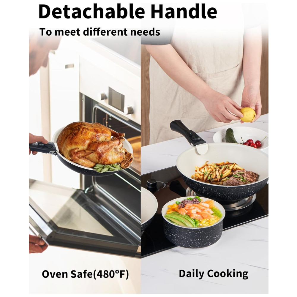 Experiência de Cozinha Versátil: Com alças removíveis que se encaixam em todas as panelas e frigideiras do conjunto, você pode usar os utensílios no fogão, forno, grelha, geladeira e até mesmo na mesa. Um conjunto perfeito para todos os cenários da sua cozinha, oferecendo flexibilidade e praticidade em cada preparo.