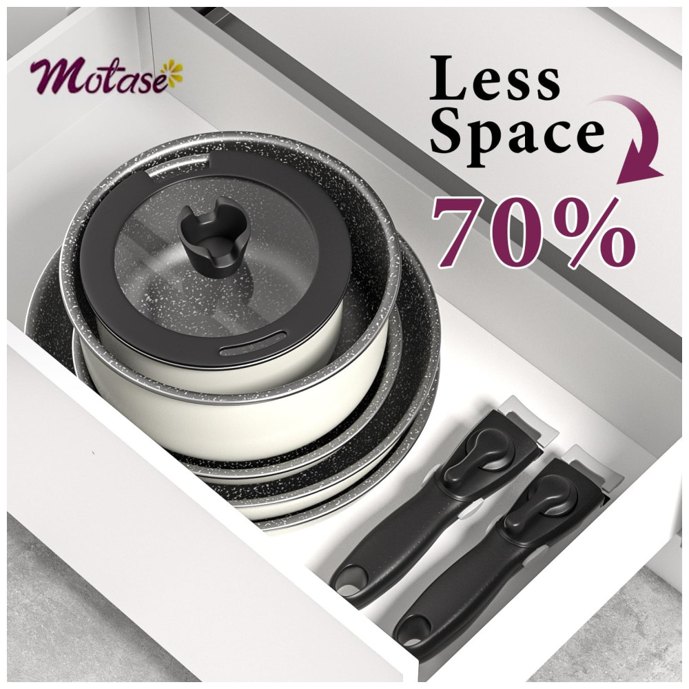 Armazenamento Compacto e Eficiente: A alça removível também facilita o empilhamento dos utensílios, economizando até 50% mais espaço nos seus armários, mantendo sua cozinha organizada.
