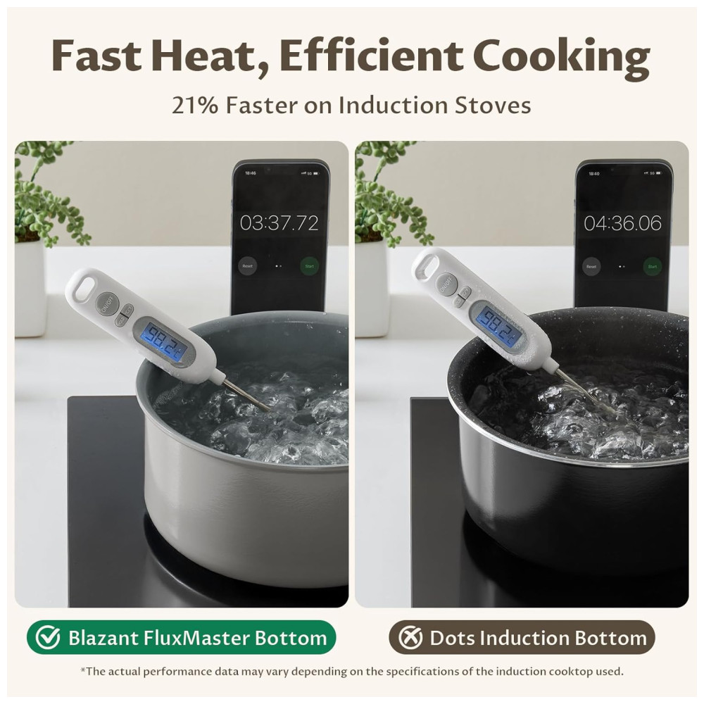 Sem Mais Resíduos Pretos: O fundo FluxMaster previne o acúmulo de resíduos pretos, mantendo as panelas de indução limpas e brilhantes, mesmo após a lavagem na máquina de lavar louça. Agora, a limpeza é muito mais fácil e sem complicação.