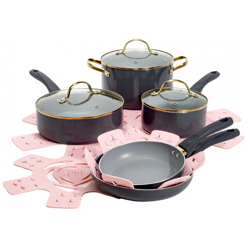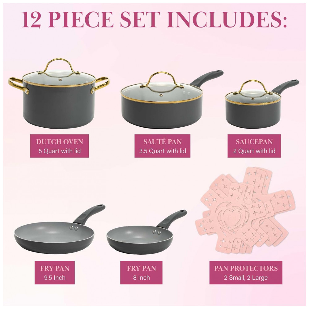 O conjunto de panelas e panelas épicas inclui: frigideira de 20,32 centímetros, frigideira de 24,13 centímetros, frigideira de 2 litros com tampa, frigideira de 3,5 litros com tampa, panela de 5 litros com tampa e 4 protetores de feltro. As tampas são feitas de vidro temperado e possuem ventilação. Adequado para uso com todos os fogões: elétricos, de vidro, a gás e de indução.