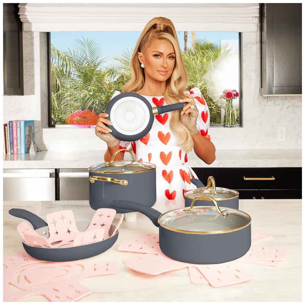 SEJA UM BOSS BABE NA COZINHA: Confira todos os itens essenciais para a casa que Paris Hilton tem além deste conjunto de panelas: conjuntos de assadeiras, utensílios de cozinha, garrafas de água, acessórios para vinho, conjuntos de talheres e até um frigobar. Disponível em várias cores, até rosa, para combinar com qualquer decoração de casa ou apartamento