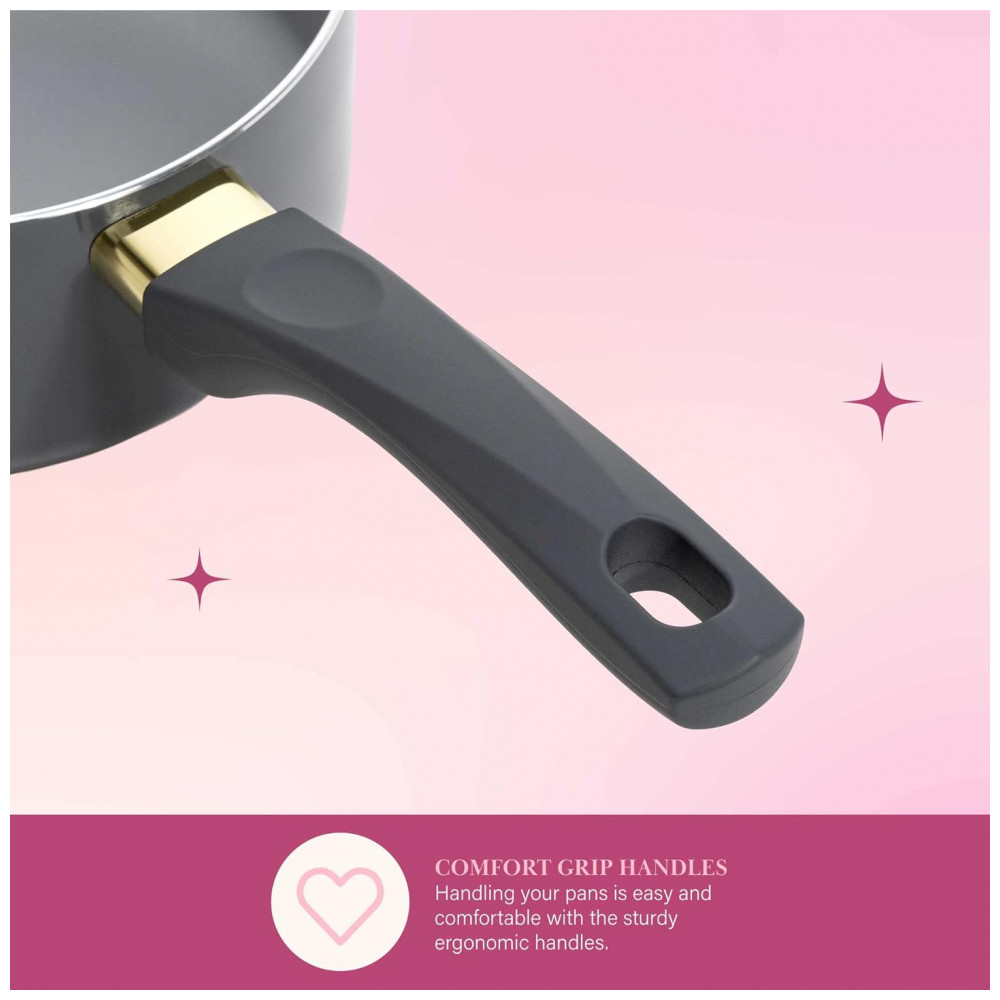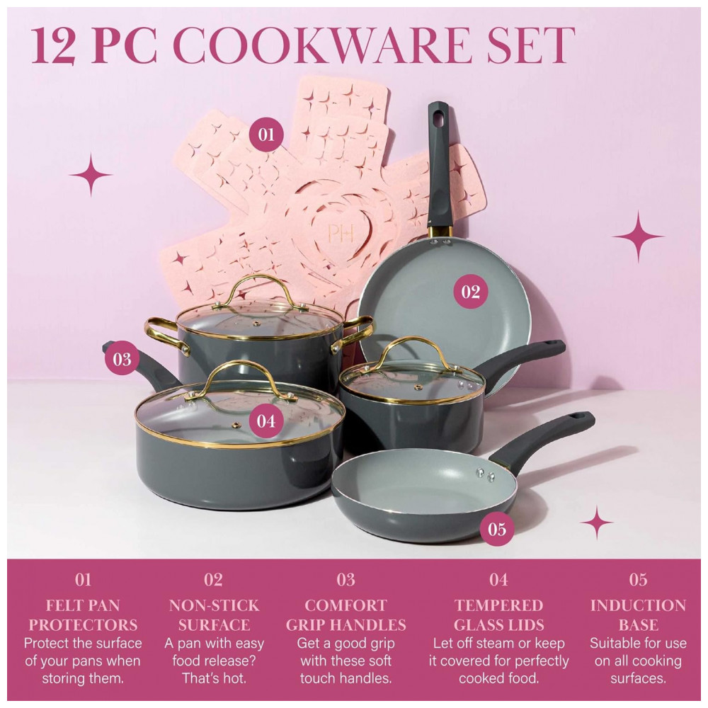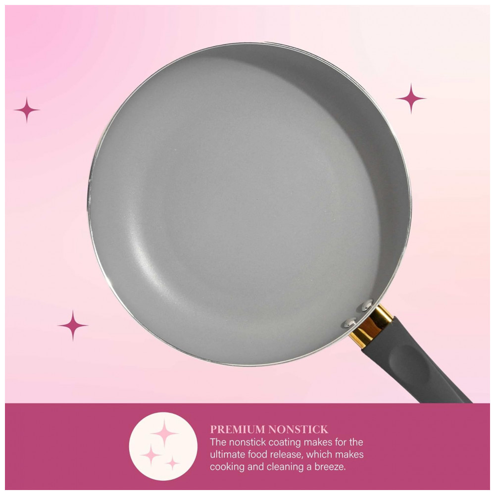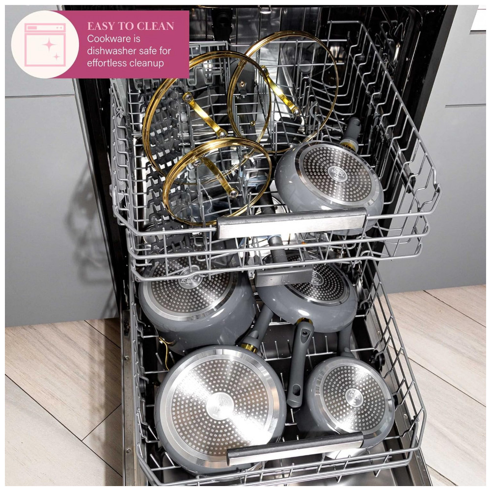 COZINHA COM ESTILO: O toque suave e as alças que permanecem frescas proporcionam conforto e controle enquanto sua criação culinária ferve. O revestimento antiaderente multicamadas permite fácil liberação e limpeza de alimentos. Salve sua manicure, não é necessário esfregar, pois este é um conjunto de panelas e frigideiras que pode ser lavado na máquina de lavar louça, a limpeza é simples.