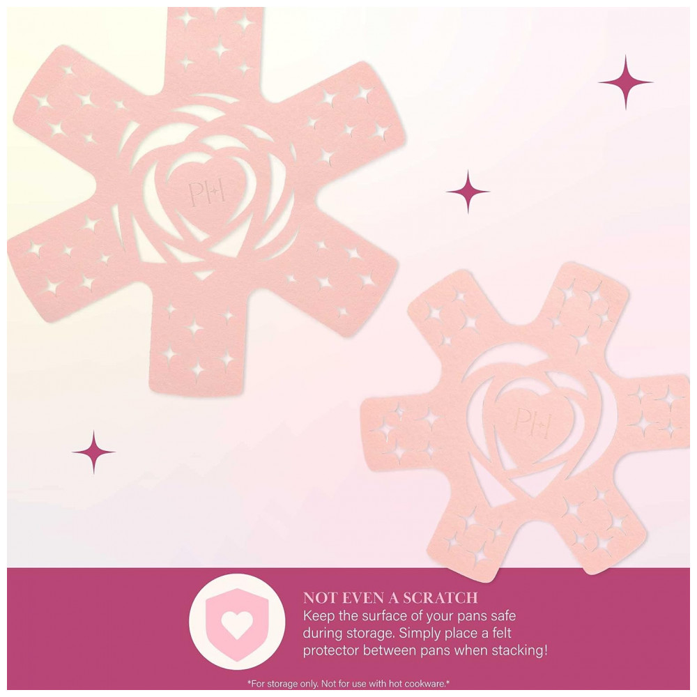 O conjunto de panelas e panelas épicas inclui: frigideira de 20,32 centímetros, frigideira de 24,13 centímetros, frigideira de 2 litros com tampa, frigideira de 3,5 litros com tampa, panela de 5 litros com tampa e 4 protetores de feltro. As tampas são feitas de vidro temperado e possuem ventilação. Adequado para uso com todos os fogões: elétricos, de vidro, a gás e de indução.