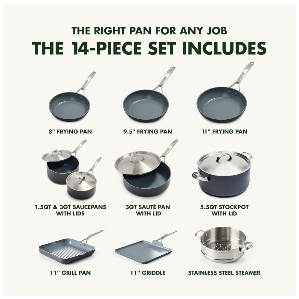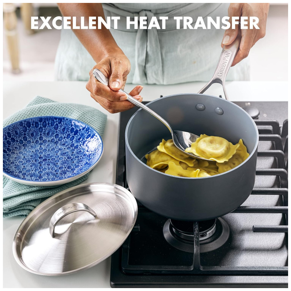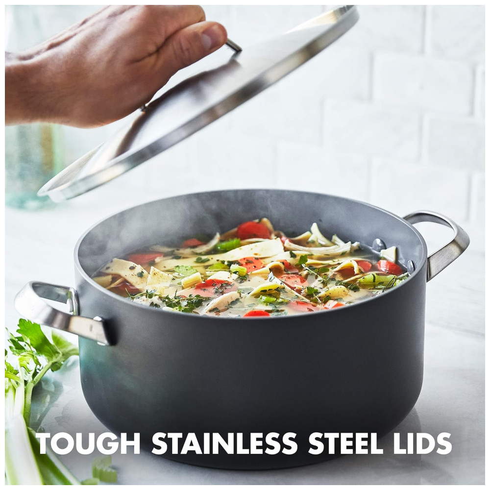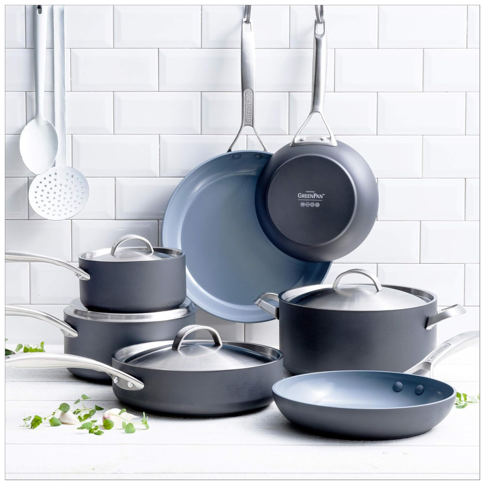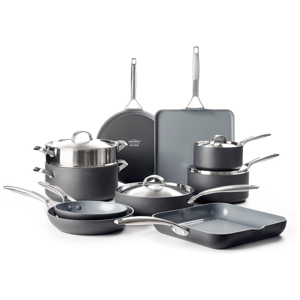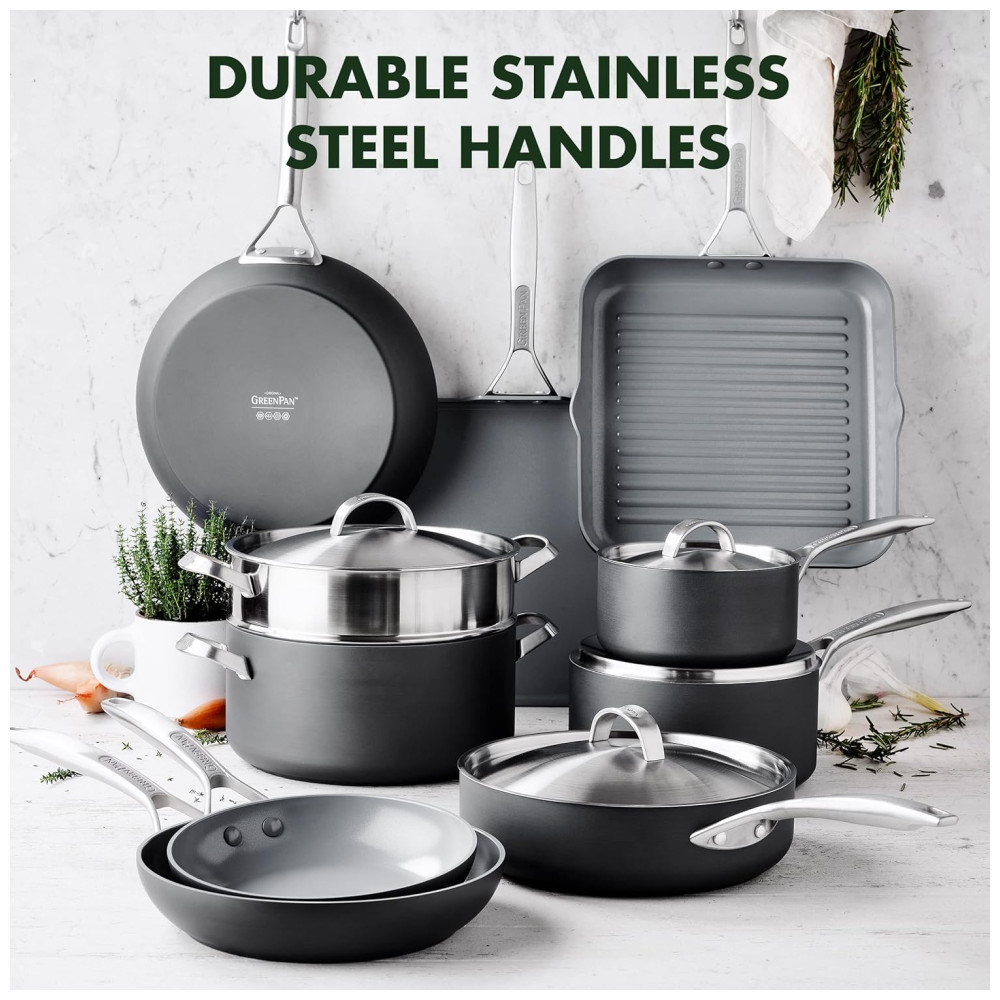 Jogo de Panelas e Frigideiras com Tampas de Aço Inoxidável e Revestimento Cerâmico 14 Peças GreenPan Cinza