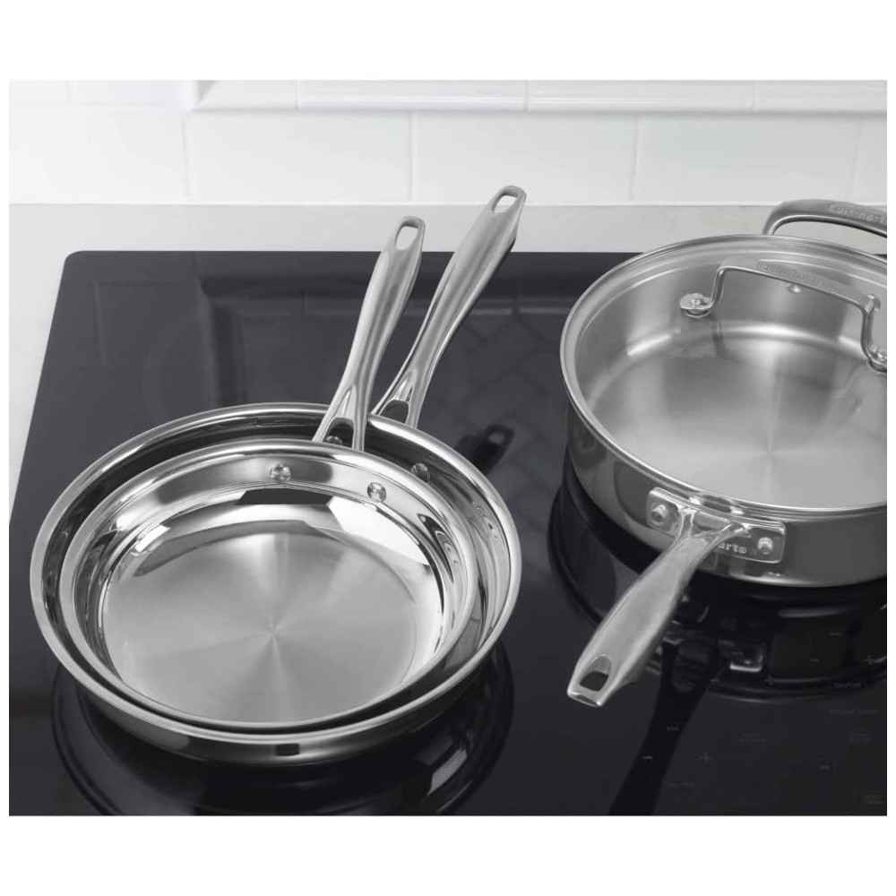 Obtenha resultados profissionais na cozinha com este conjunto de dez peças Cuisinart Classic TriPly em aço inoxidável. O conjunto inclui uma panela de 1,4 litros com tampa, uma panela de 2,3 litros com tampa, uma frigideira de 2,8 litros com alça auxiliar e tampa, uma panela de 5,60 litros com tampa e Frigideiras de 20 e 25 cm.