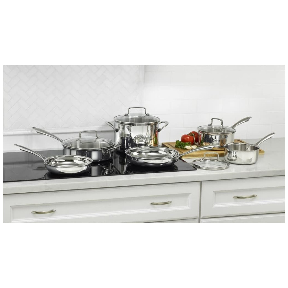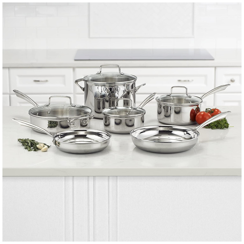 Jogo de Panelas e Frigideiras em Aço Inoxidável com 10 Peças Bordas Cônicas para Vazamento sem Gotejamento e Alças de Aderência Fria Cuisinart TPS-10 Prata