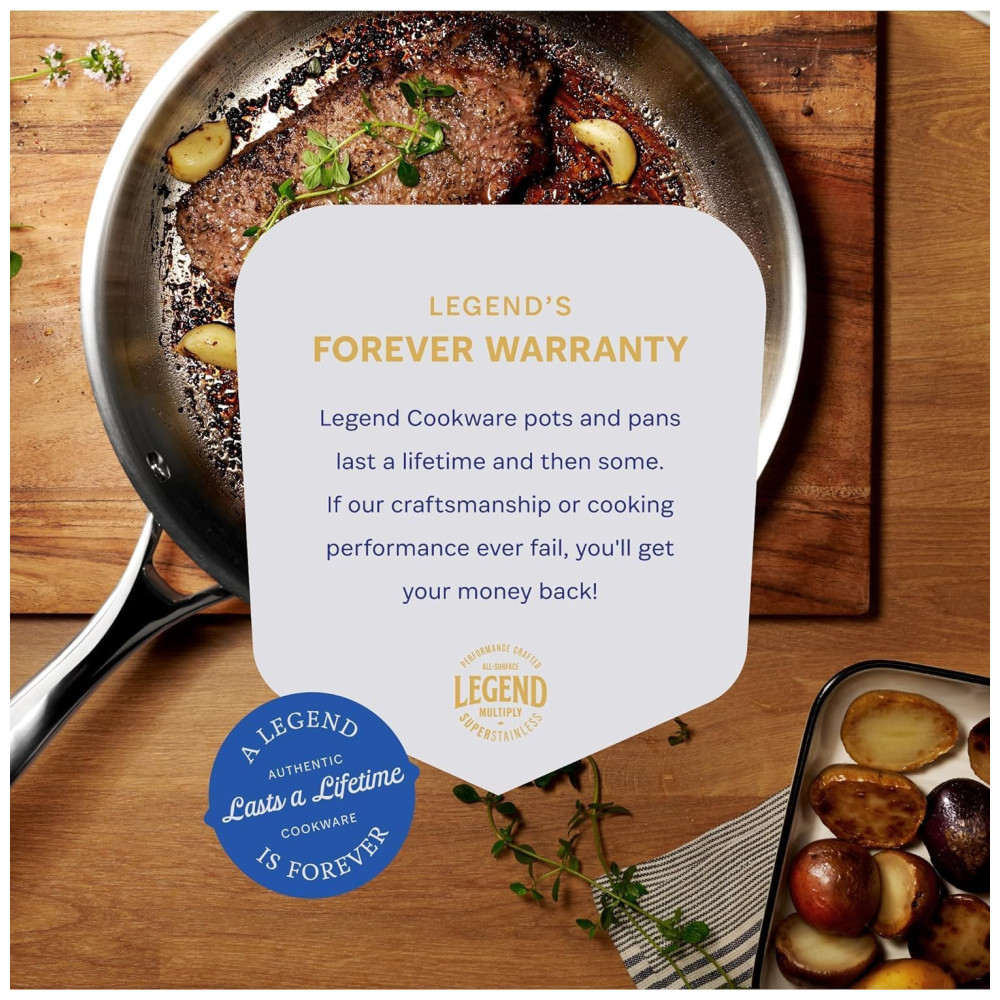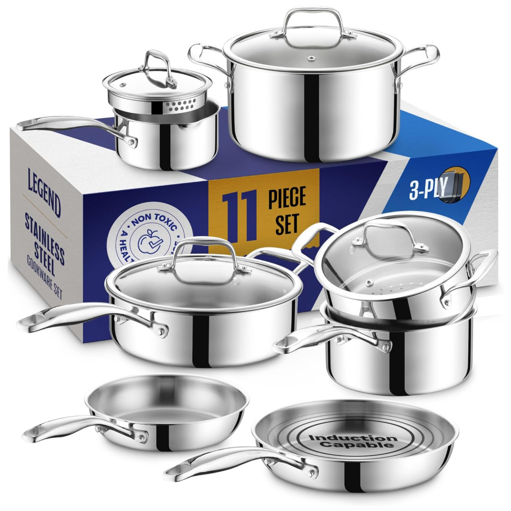 Jogo de Panelas e Frigideiras em Aço Inoxidável com 11 Peças Tampas de Vidro e Utensílios de Cozinha LEGEND COOKWARE Prata