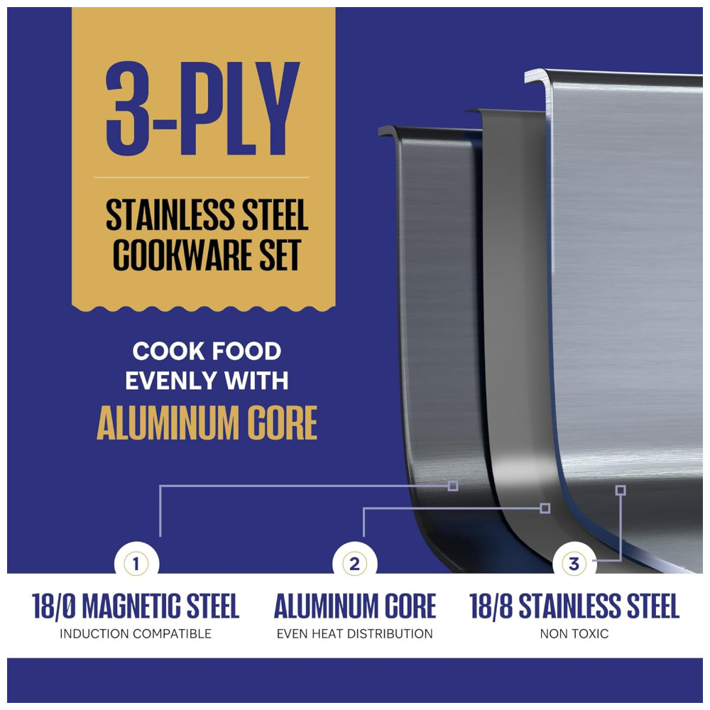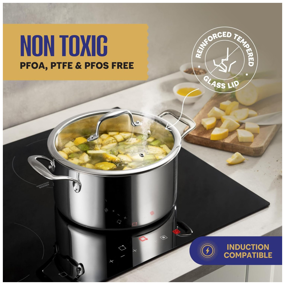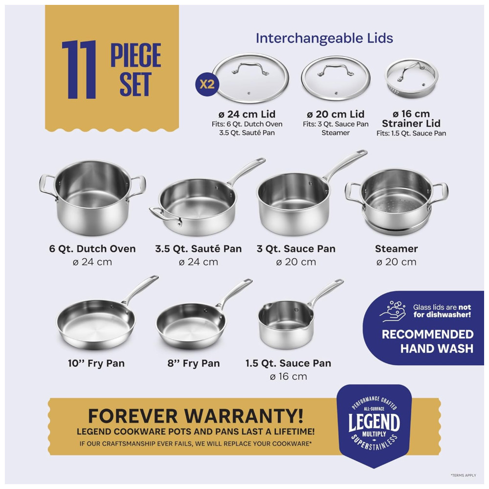 O conjunto de panelas e frigideiras Legend é feito de aço inoxidável de alta qualidade, com tecnologia de revestimento MultiPly de 3 camadas para um desempenho superior na cozinha. O conjunto inclui 11 peças, como panelas, frigideiras, forno holandês e conjunto de vaporizador. As tampas de vidro temperado possuem bordas largas que se encaixam perfeitamente nas panelas e frigideiras. As marcações em Litros no interior das tampas facilitam o acompanhamento do cozimento.
