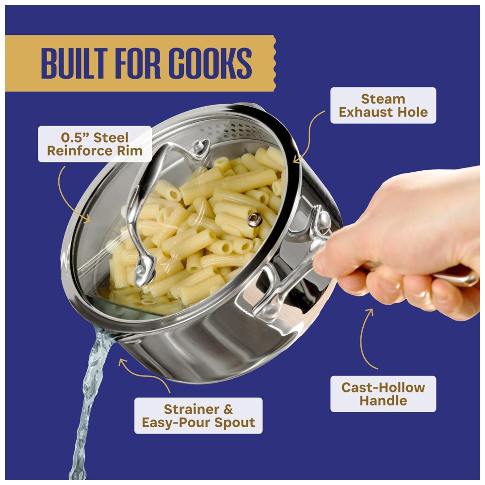 As panelas podem ser utilizadas em qualquer tipo de fogão, incluindo indução, e são seguras para uso no forno até 230ºC. Os bicos moldados facilitam o derramamento de caldos e molhos, enquanto os orifícios de drenagem integrados ajudam na remoção de sólidos grandes.