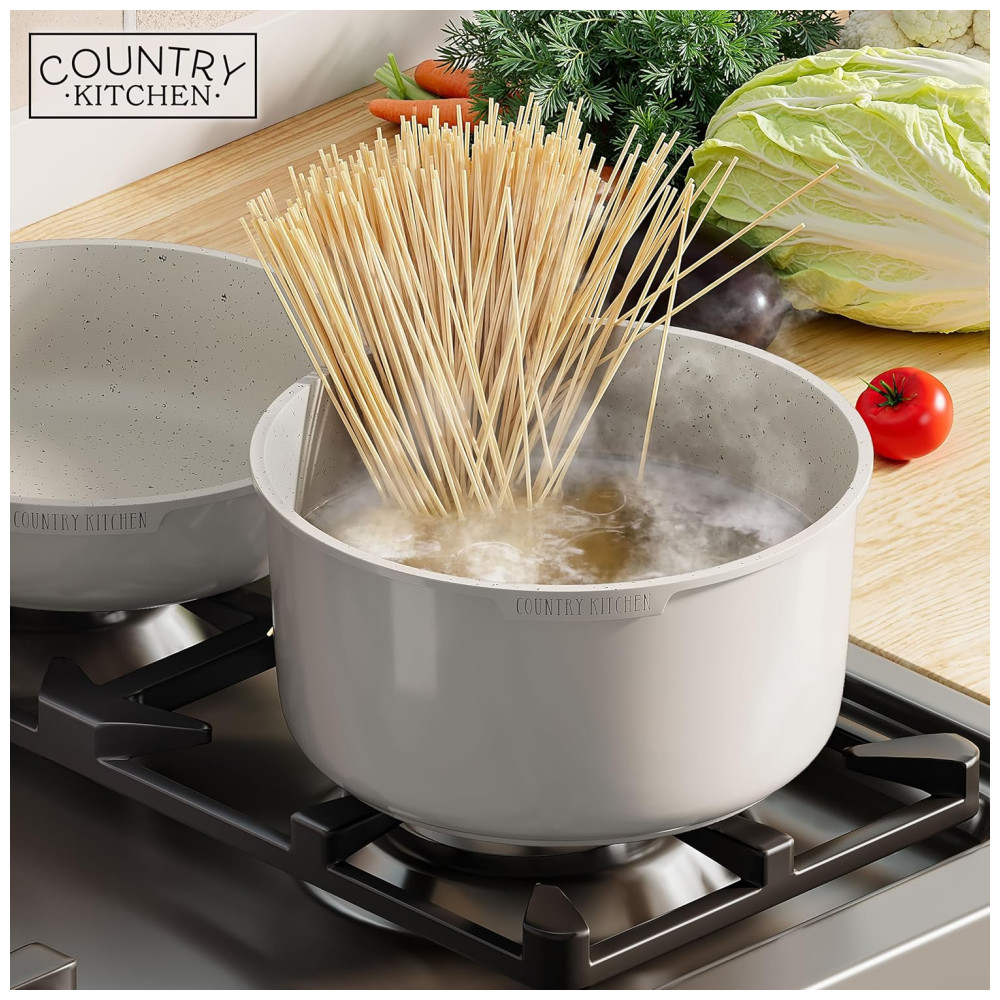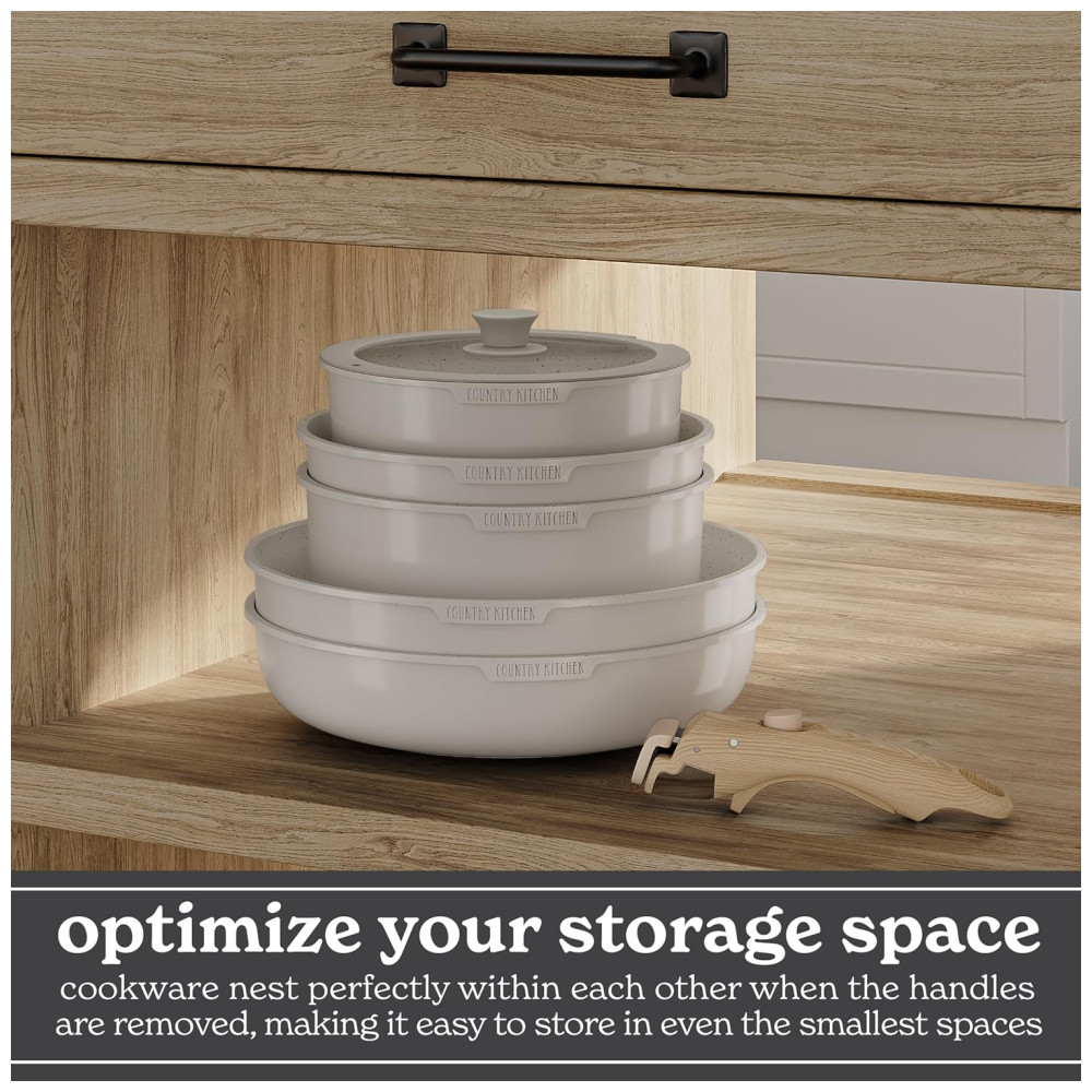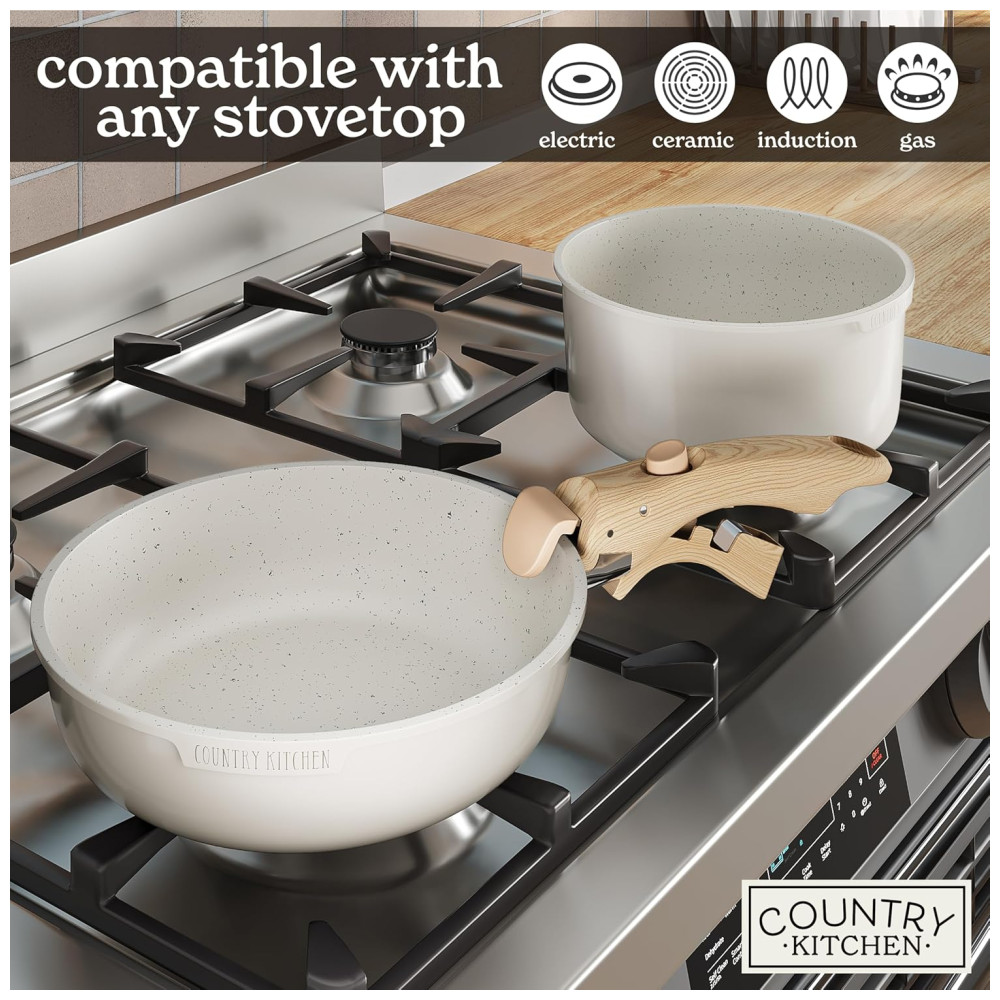 Jogo de Panelas e Frigideiras Material em Alumínio com 16 Peças e Cabo de Madeira Removível Country Kitchen Creme