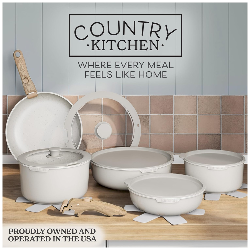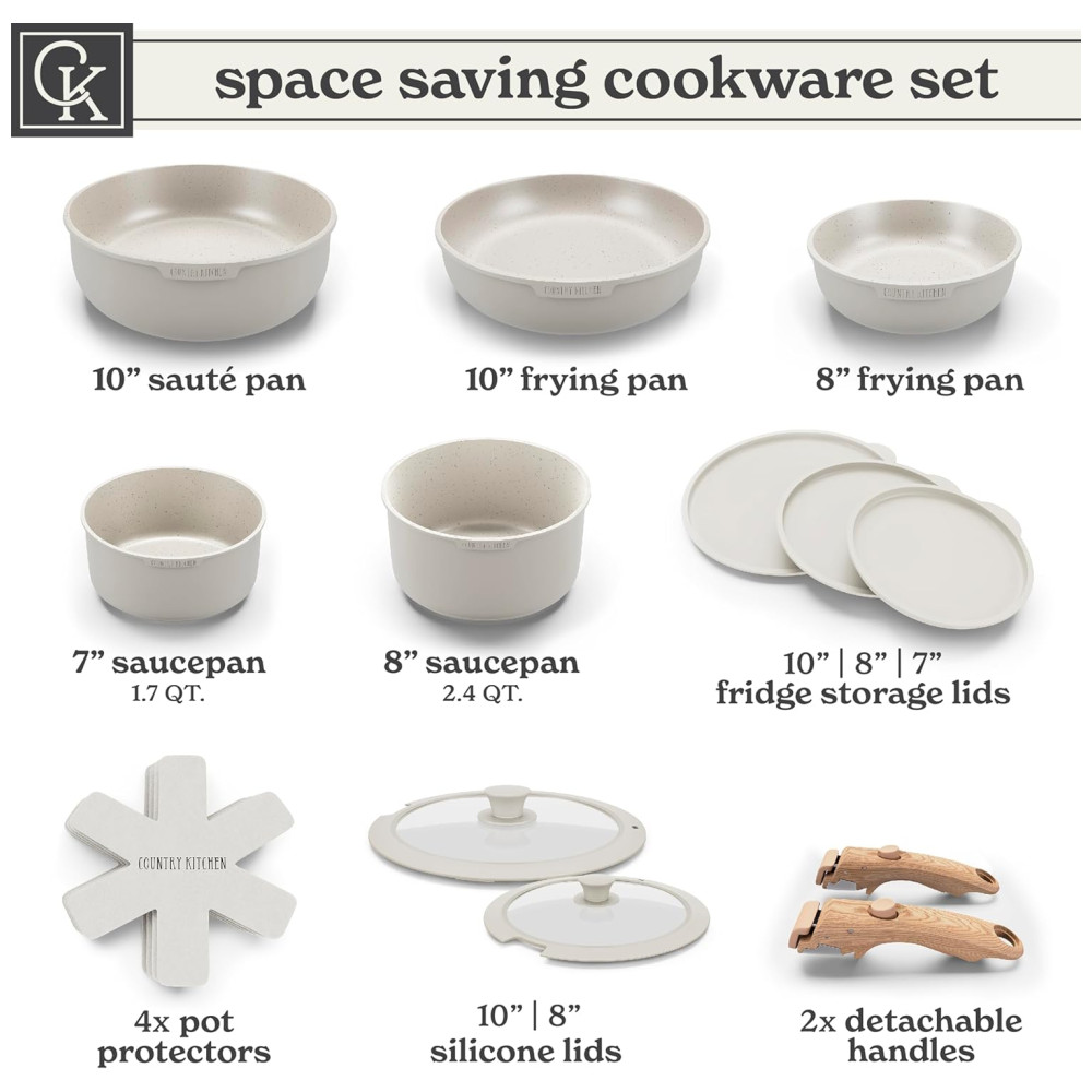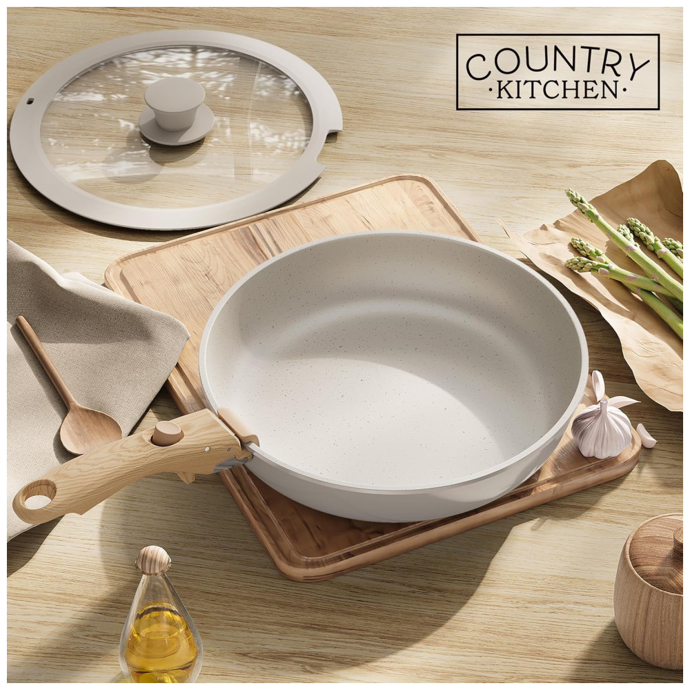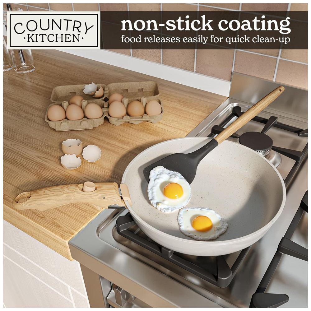 Jogo de Panelas e Frigideiras Material em Alumínio com 16 Peças e Cabo de Madeira Removível Country Kitchen Creme