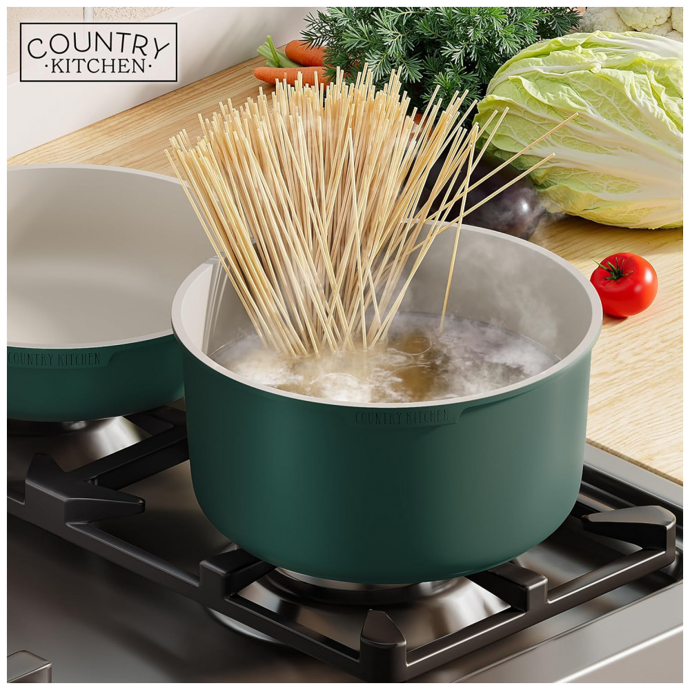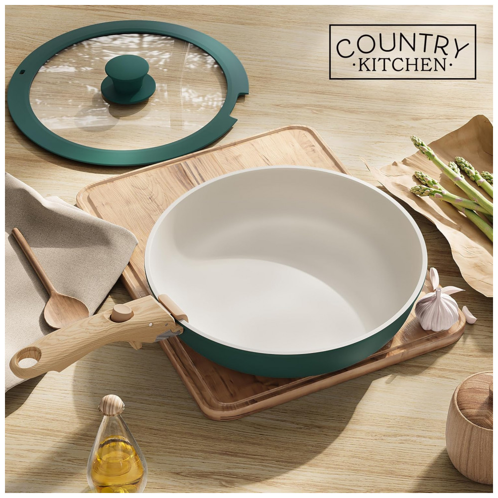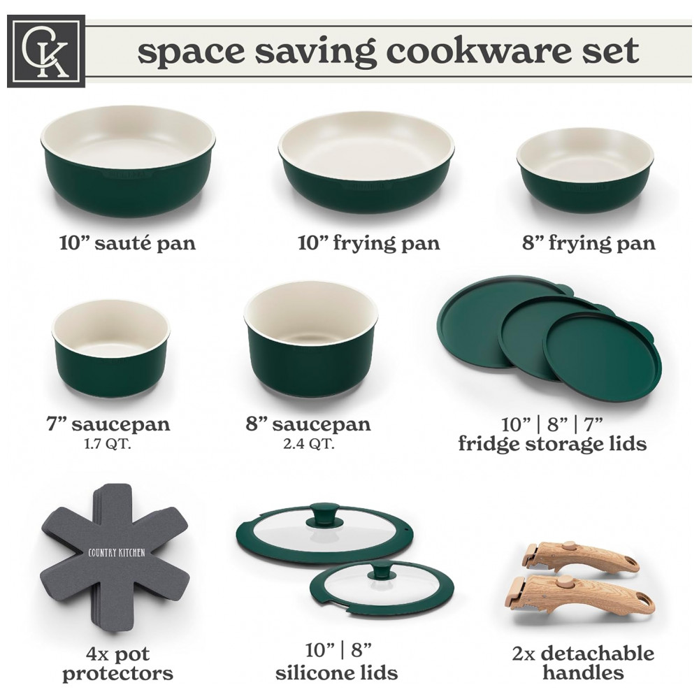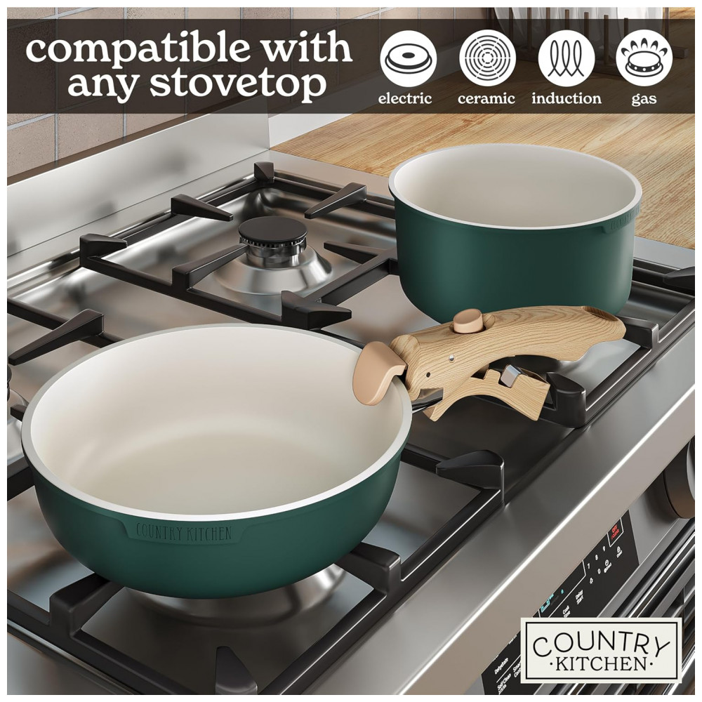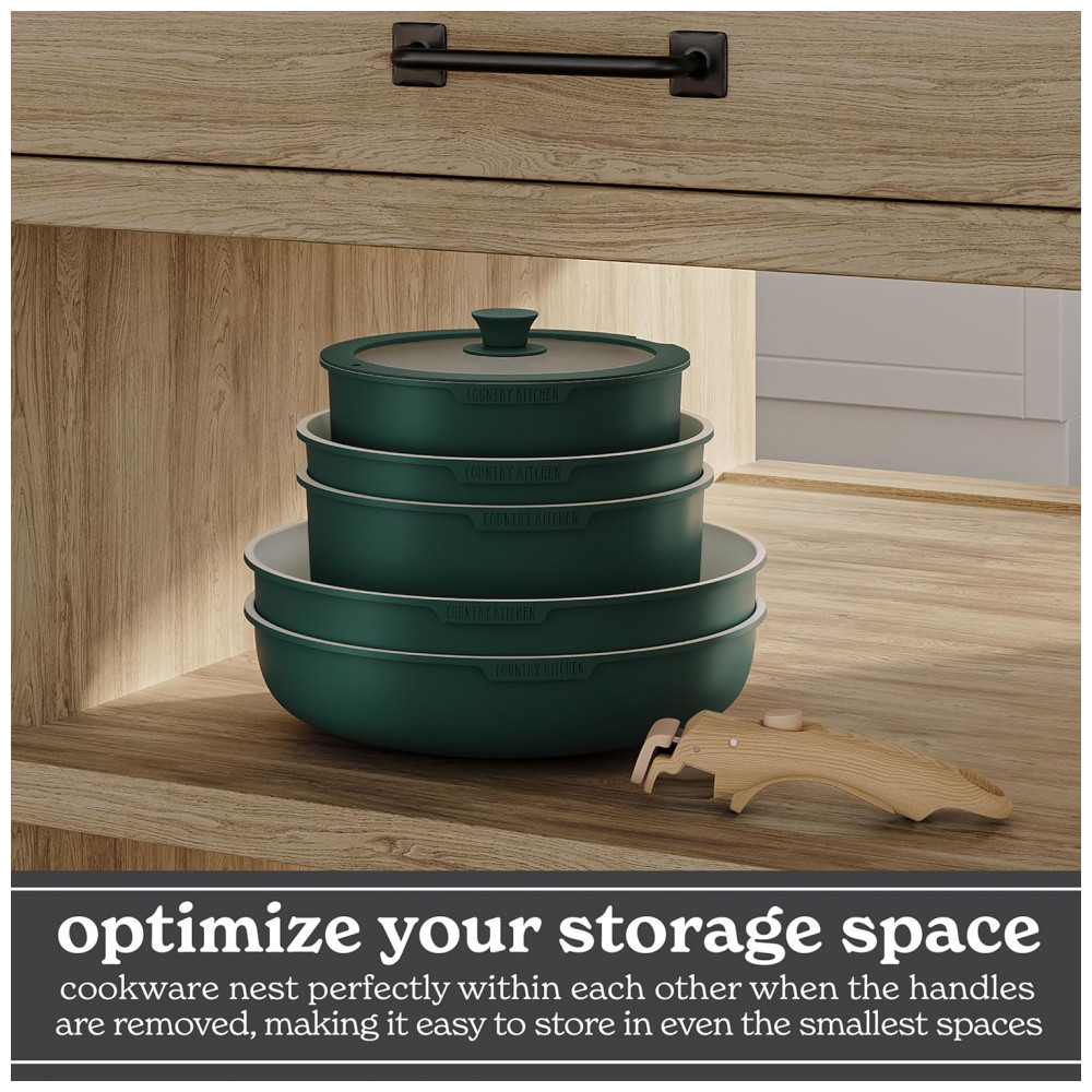 Jogo de Panelas e Frigideiras Material em Alumínio com 16 Peças e Cabo de Madeira Removível Country Kitchen Verde Escuro