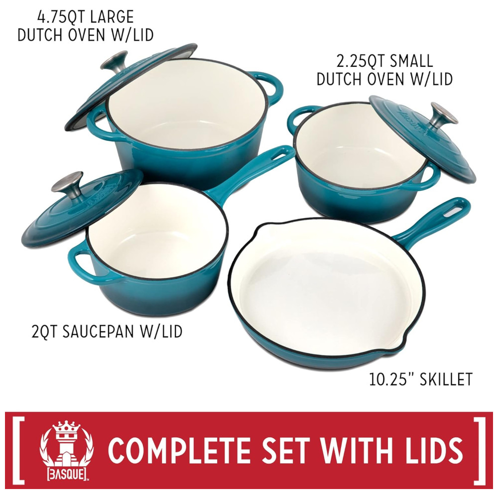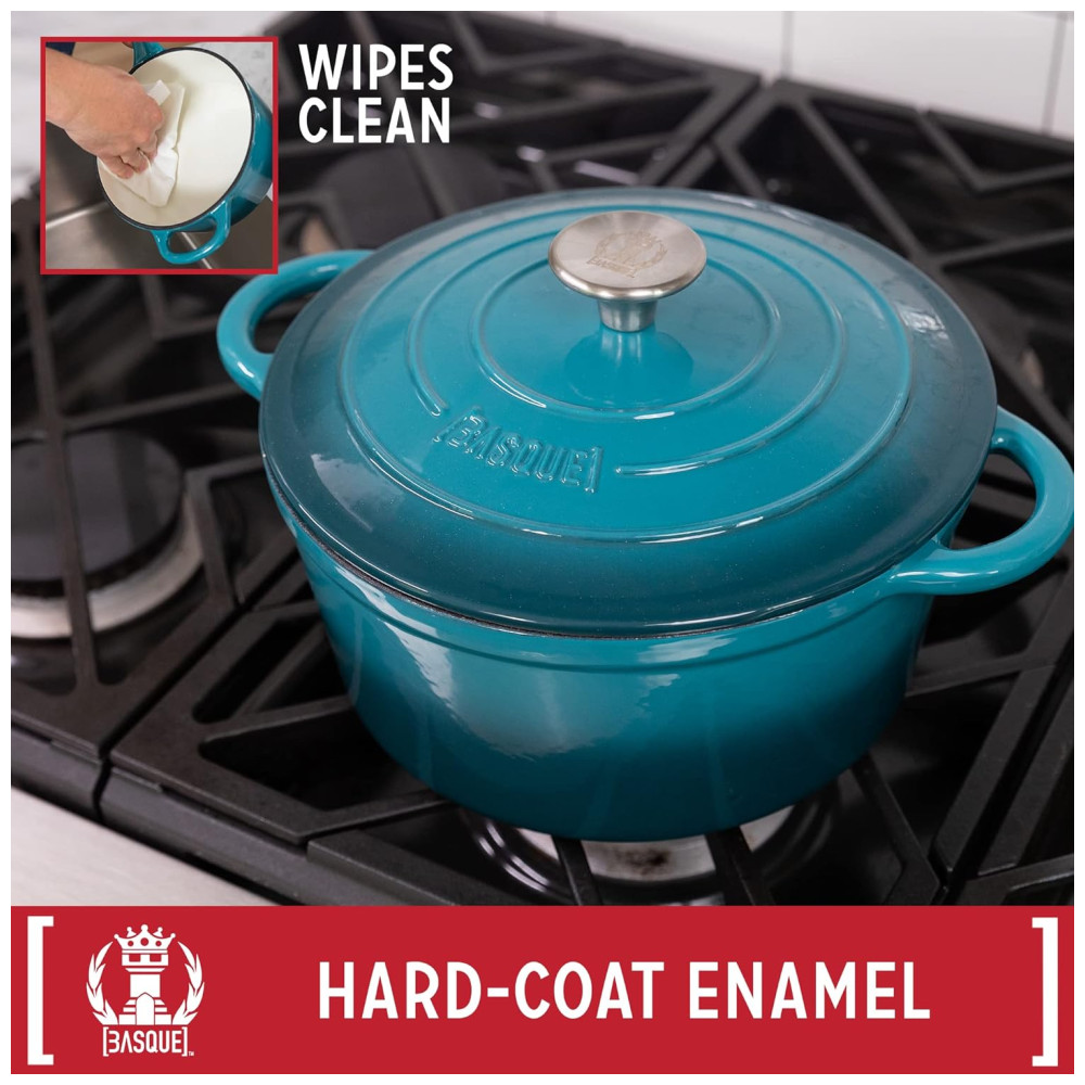 CONJUNTO DE COZINHAS DE FERRO FUNDIDO O conjunto de panelas de 7 peças da Basque é feito de ferro fundido de longa duração que fornece distribuição e retenção de calor superiores, para que seus alimentos cozinhem uniformemente. O conjunto de 7 peças inclui tudo que você precisa com frigideira, panela e dois fornos holandeses