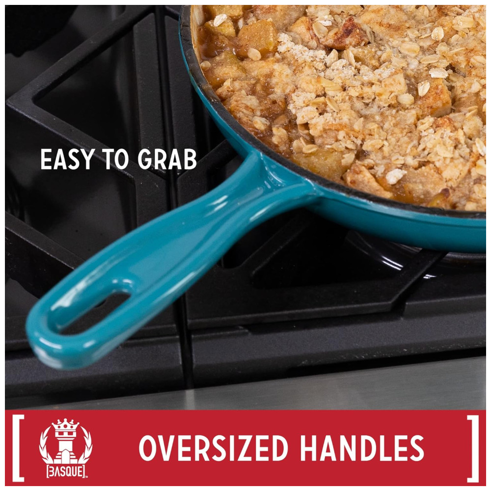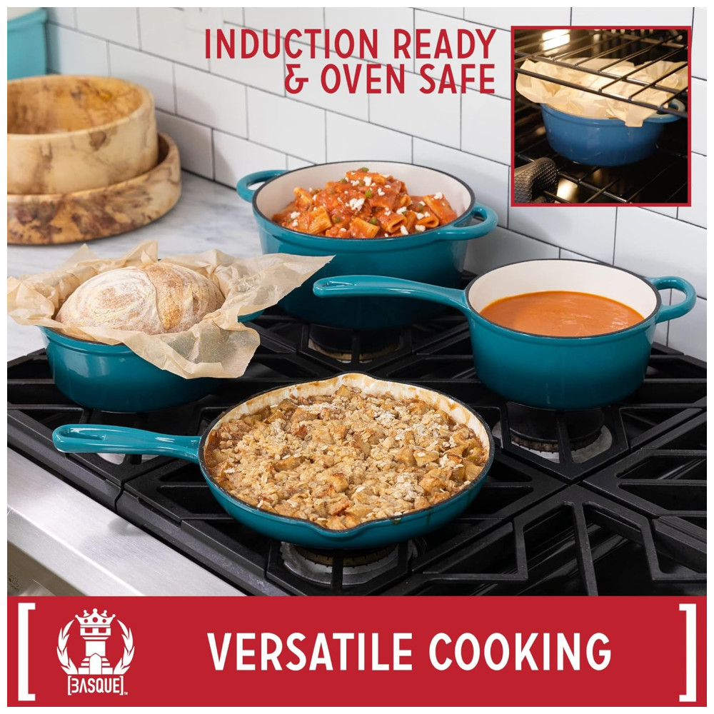 COZINHA VERSÁTIL As panelas de ferro fundido são conhecidas por sua versatilidade. Este conjunto basco é compatível com todos os cooktops, incluindo indução, e pode ir ao forno até 260C. Você pode facilmente fazer a transição do fogão para o forno sem trocar de panela. Portanto, quer você esteja assando, assando ou salteando lentamente, as panelas de ferro fundido bascas podem lidar com isso.