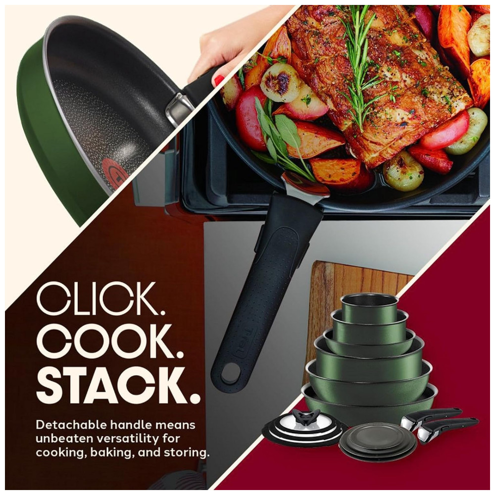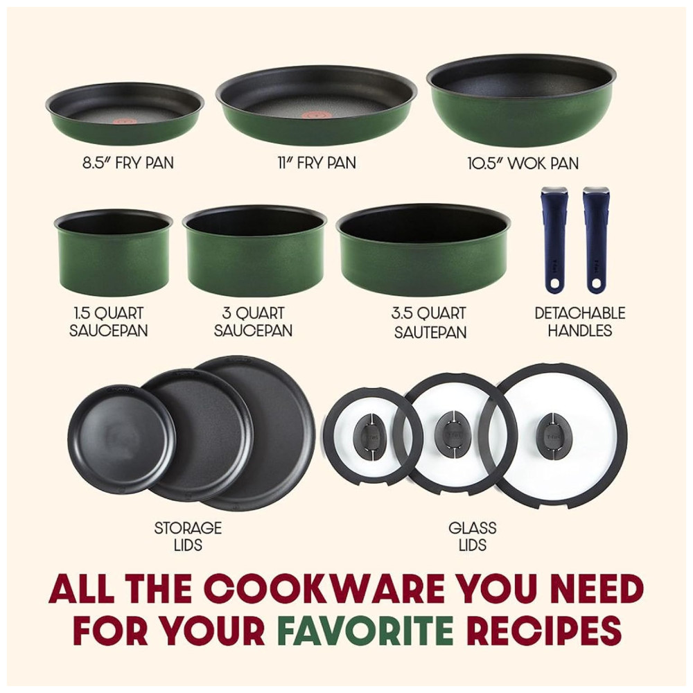 Jogo de Panelas Potes e Frigideiras Antiaderentes em Alumínio com 14 Peças e Cabo Removível T-Fal Verde Floresta