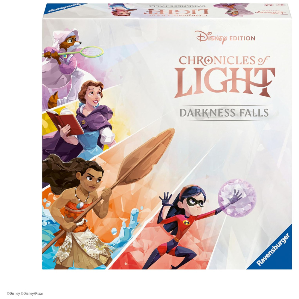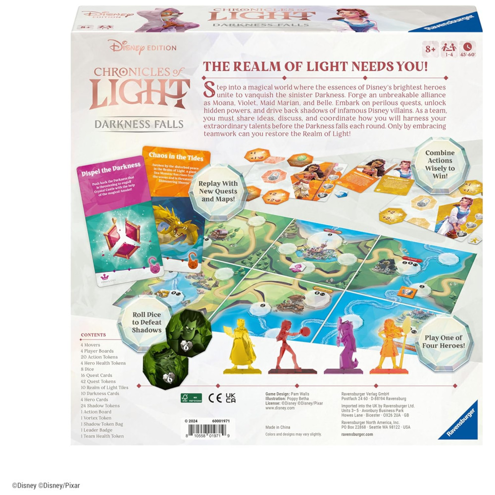 O Ravensburger Chronicles of Light Darkness Falls é um jogo de tabuleiro cooperativo para 1 a 4 participantes com personagens clássicos Disney como Moana, Belle, Violet e Maid Marian. Cada partida monta um tabuleiro modular com tiles, promovendo alta rejogabilidade através de diferentes cartas de missão, vilões e componentes dinâmicos. Inclui 4 movers, 4 tabuleiros individuais, 10 tiles de mapa, 8 dados, 16 cartas de missão, 10 cartas de escuridão, 4 cartas de herói, 1 tabuleiro de ações, 1 sacola de tokens, 1 medalha de líder e 92 tokens coloridos.